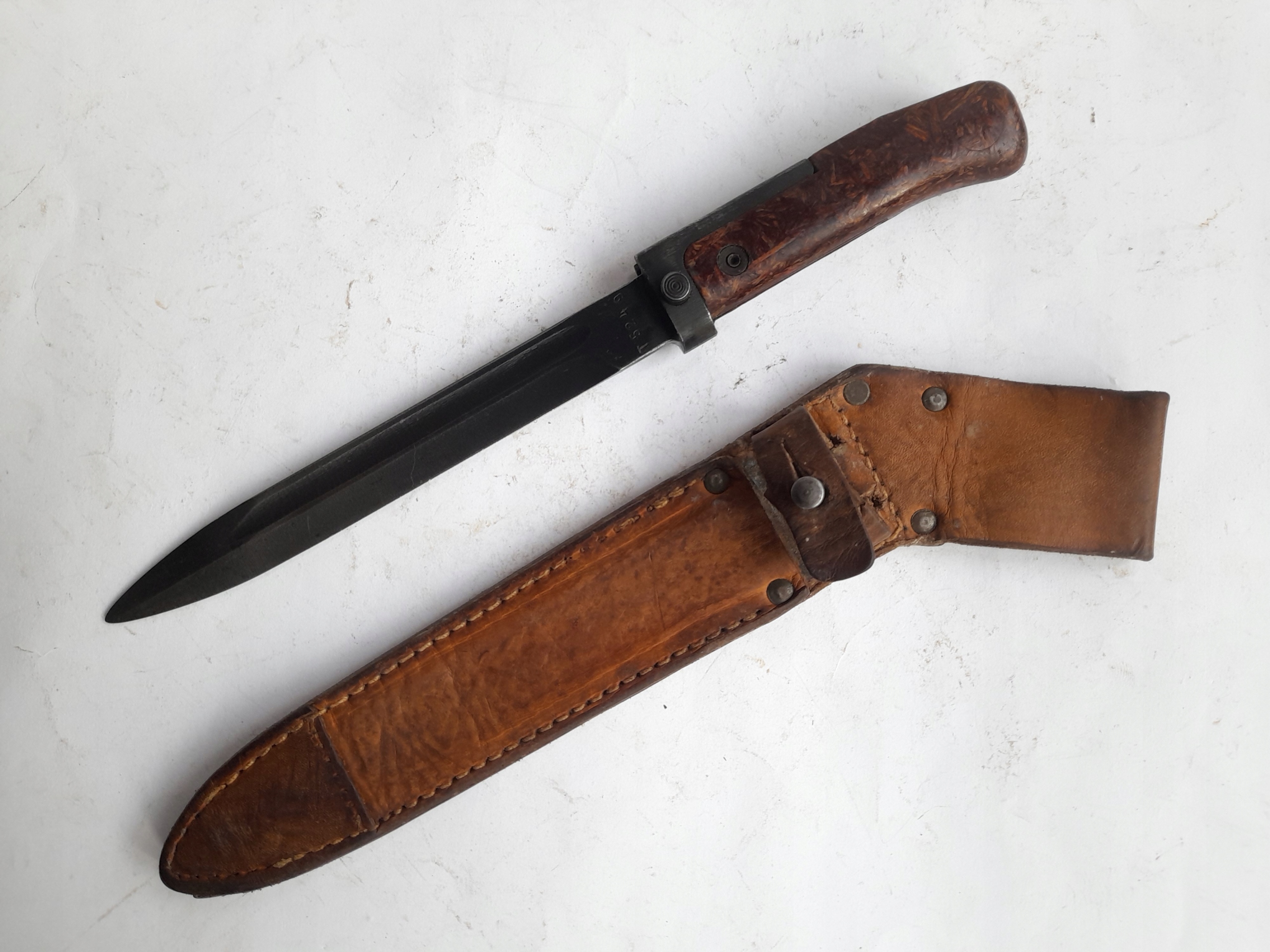 для продажи у меня есть оригинальный чешский vz58 штык с одной заклепкой, с бакелитной ручкой, с длинным JELC, закончившимся повсюду, и оригинальное кожаное влагалище, позволяющее штыковому штыке к талии. Такой штык был оснащен Чехословакийской армией.