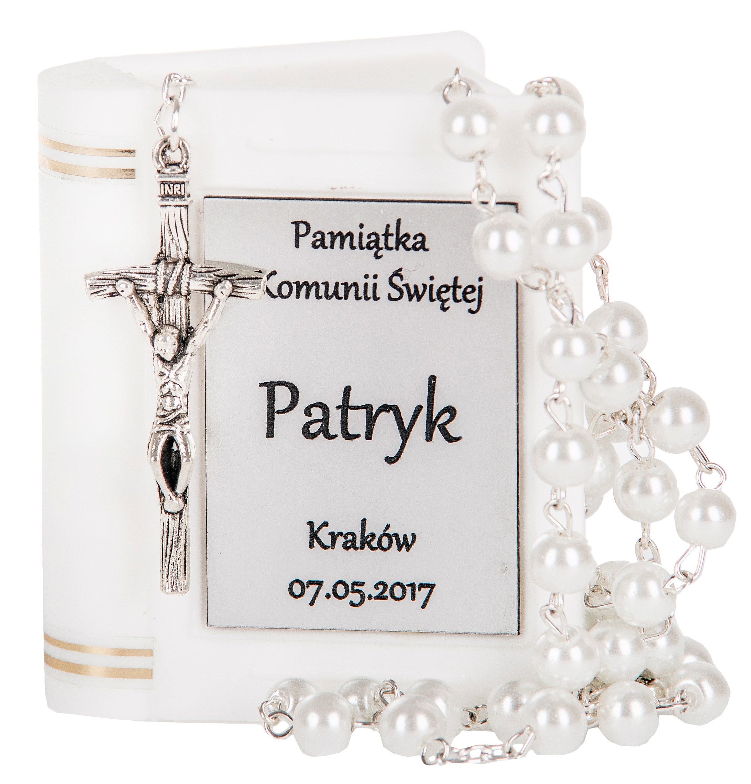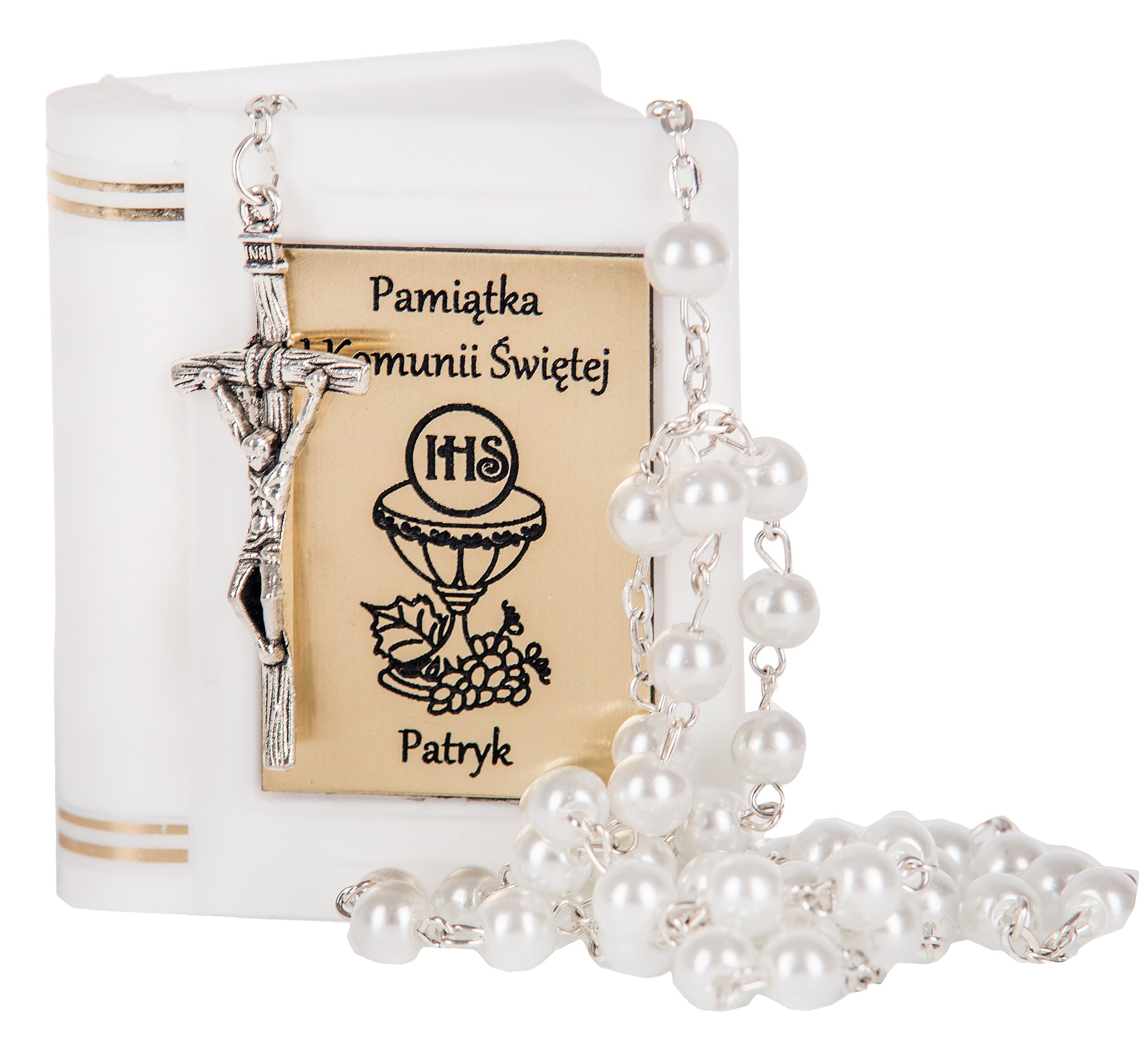 На следующем аукционе мы предлагаем Вам красивые четки с круглыми бусинами в виде жемчуга,дополнительно украшенными чашеобразным соединителем. Благодаря возможности гравировки коробки, вы можете персонализировать ее, предоставив для гравировки любой текст. Гравировка, представленная на фотографиях, выполнена с помощью лазерной технологии. Наследнику стоит выбрать подарок, который будет напоминать вам о дне вашего первого причастия. Позаботьтесь о том, чтобы навсегда сохранить мимолетные воспоминания и закажите индивидуальную гравировку с пожеланиями или посвящением.