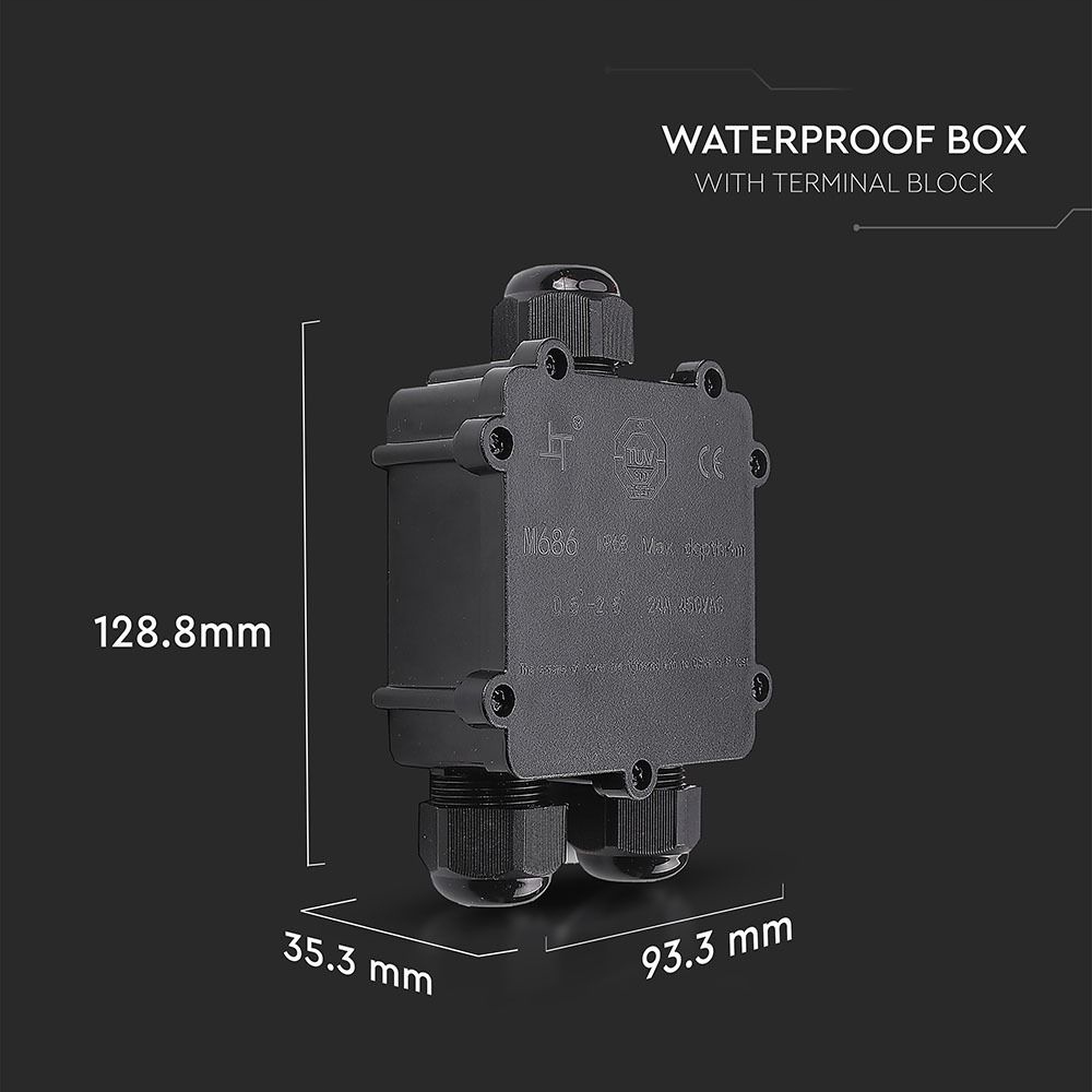 Герметичная кабельная коробка VT-871 от V-TAC® облегчает установку внешних светодиодных светильников и герметичное соединение четырех заземляющих кабелей. Резьбовые элементы с уплотнениями зажимают кабель - класс герметичности IP68. Диаметр кабеля от 8 до 12 мм, внутри коробки 4х2,5 мм электрического куба. Черный корпус из полипропилена.