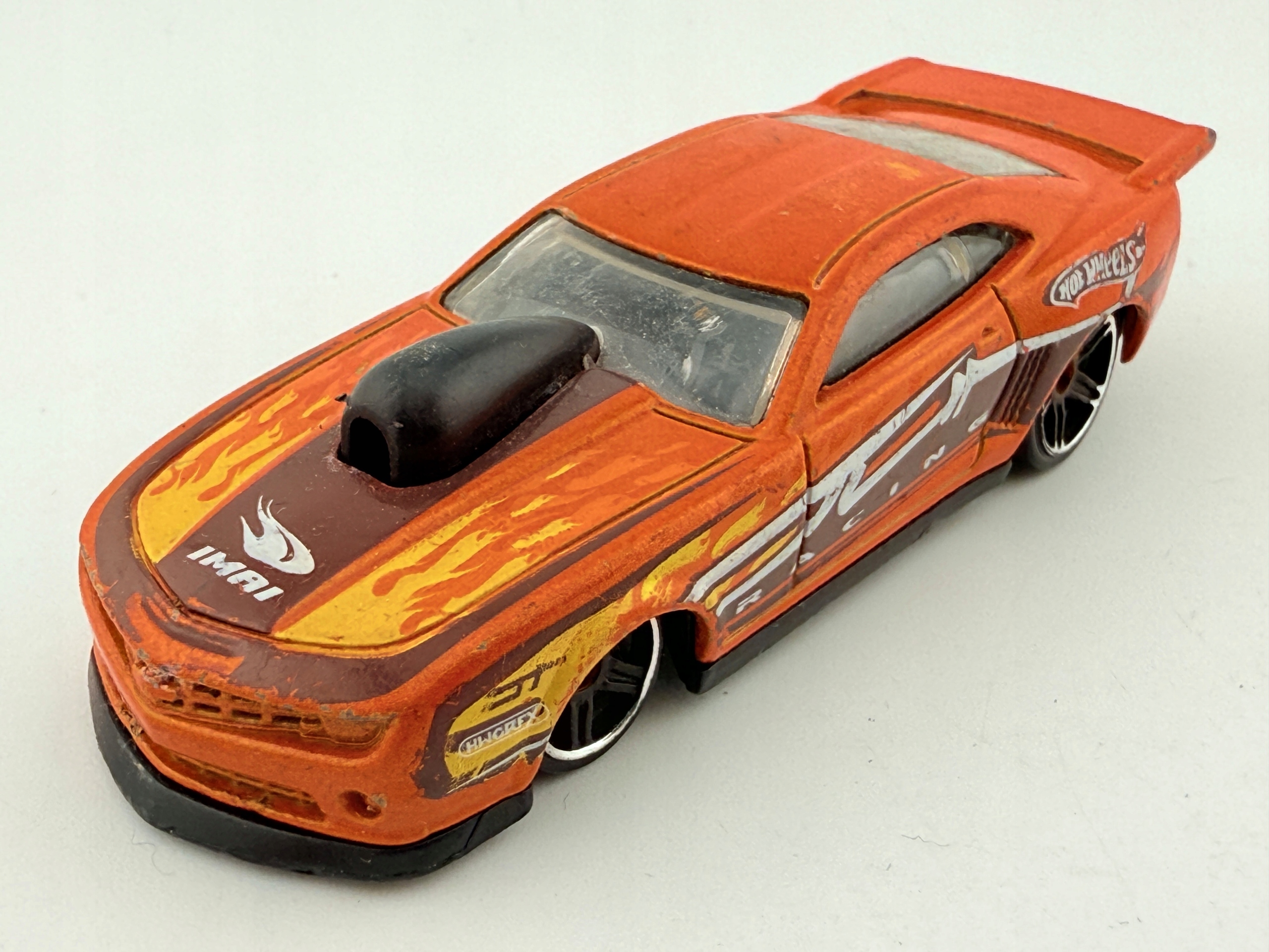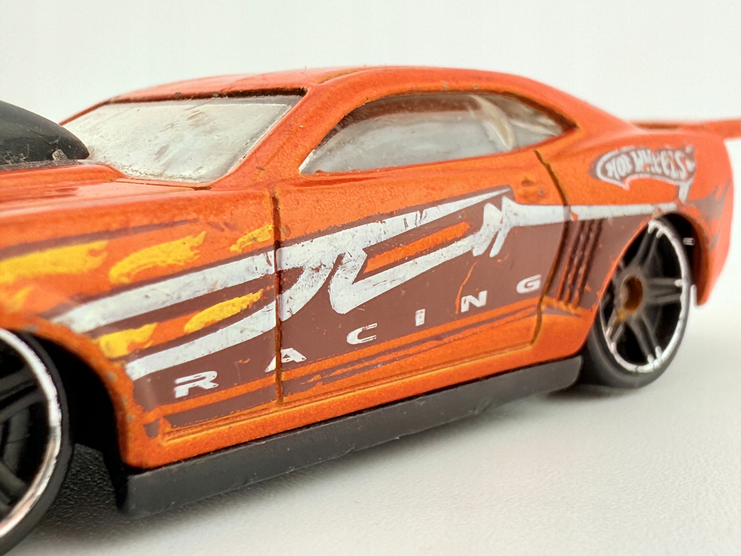 пружина представляет модель Camaro в интенсивном оранжевом цвете с эффективным пламенем в оттенках красного и желтого. Изготовленный из металла и пластика, он твердый и визуально привлекательный. Дополнительным преимуществом является спойлер и открывающая крыша, которая дает ему спортивный характер. Модель находится в хорошем состоянии, с видимыми небольшими функциями, что делает ее интересным для коллекционеров. Его уникальный дизайн и цвета привлекают внимание, а качество изготовления делает его интересным элементом каждой коллекции.