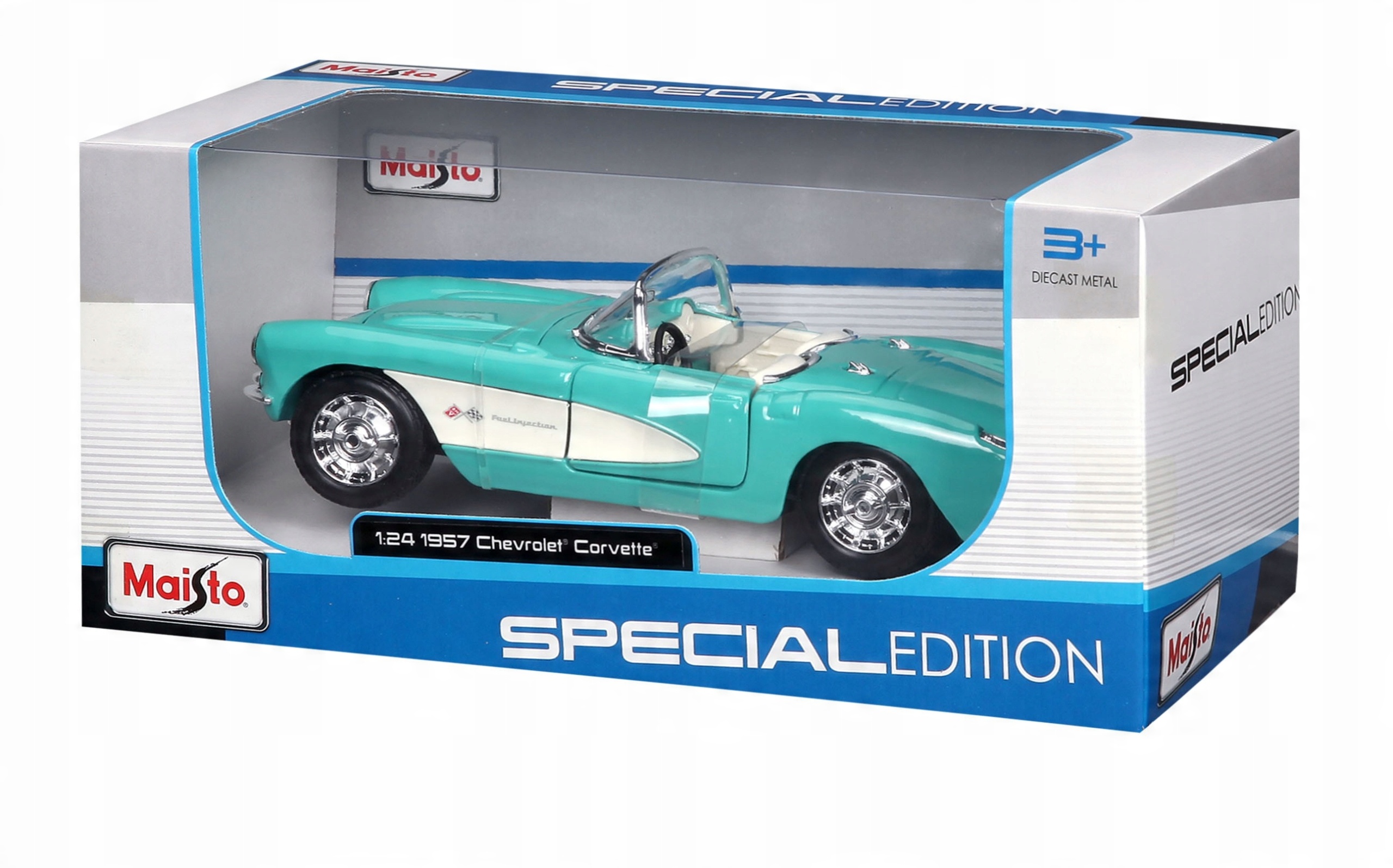 Коллекционная металлическая модель автомобиля Chevrolet Chevy Corvette C1 1957 года выпуска в масштабе 1/24 производства известной, уважаемой и авторитетной компании Maisto.
