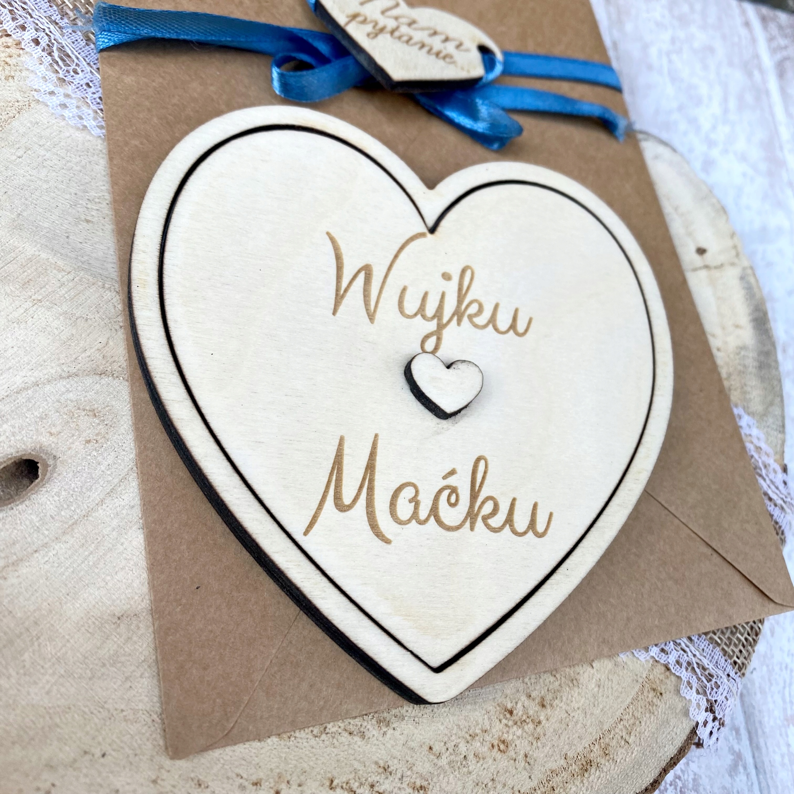- Пригласительная деревянная (сердце, размеры ок. 10 х 10 см) «С именной надписью (укажите имена крестных), например, "Тётя Каролинка", "Дядя Марцин" и т.д.