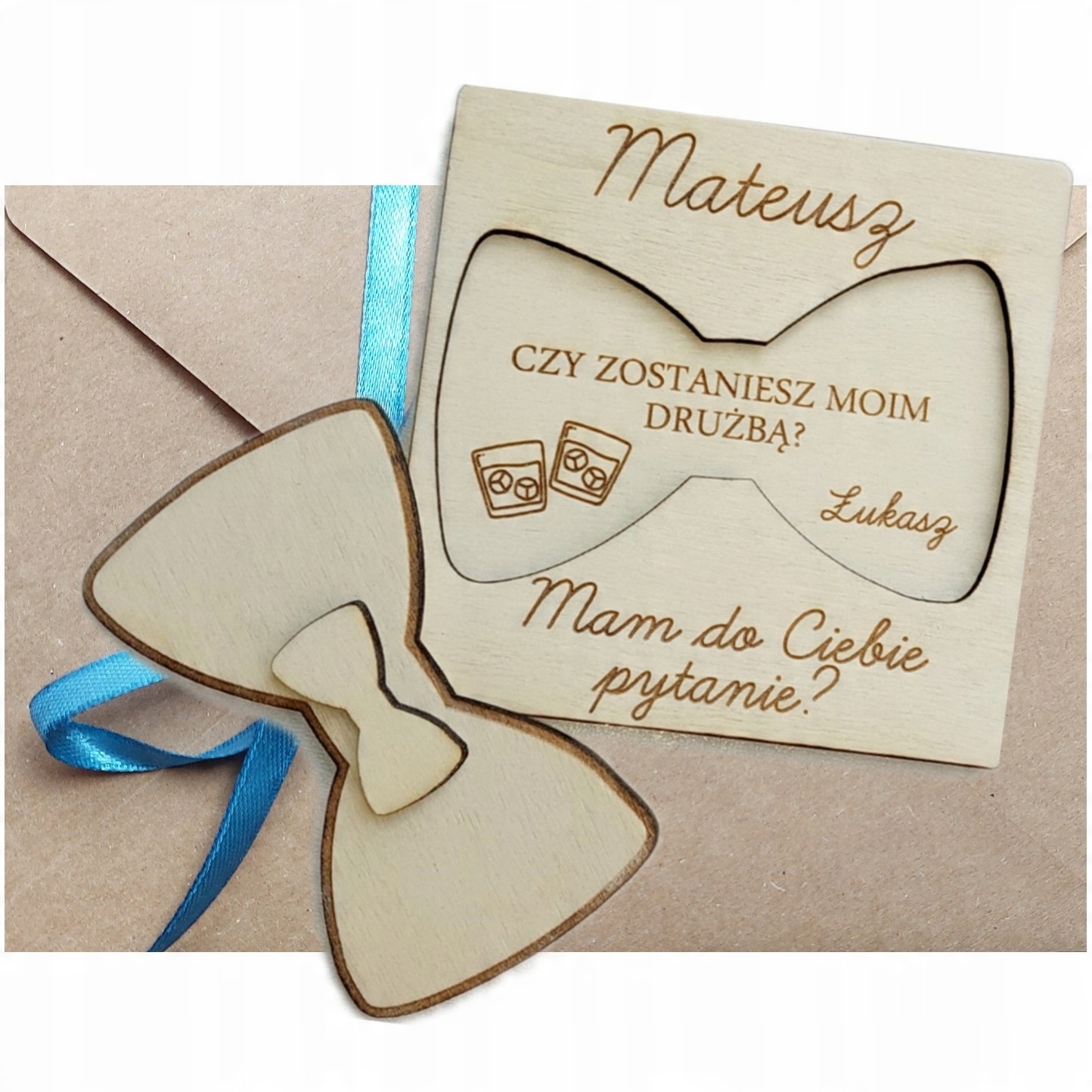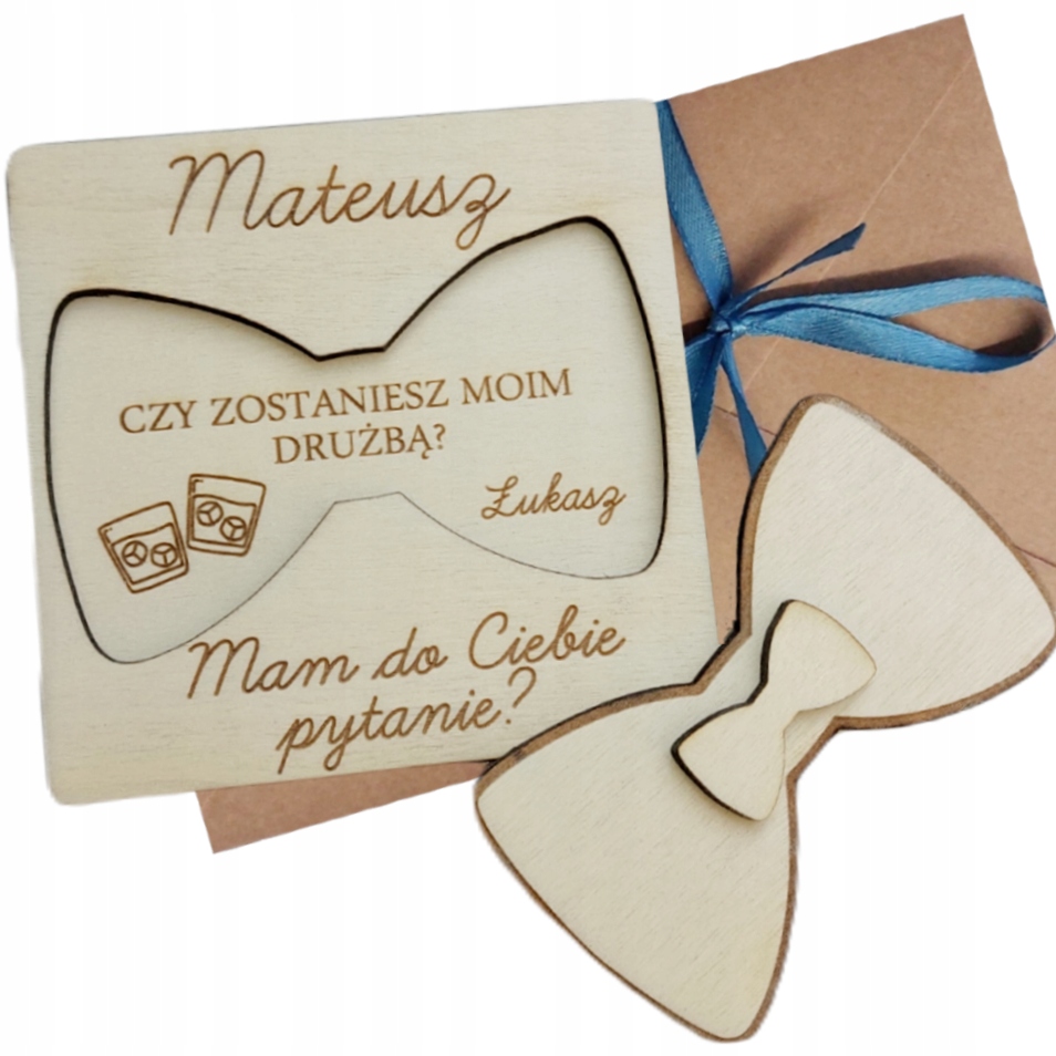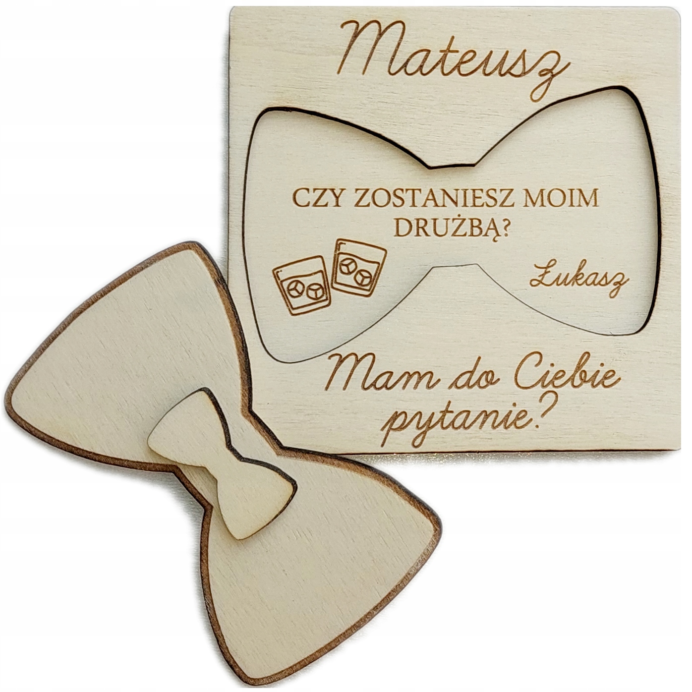 Элегантное деревянное приглашение в виде съемного бантика с просьбой быть шафером.