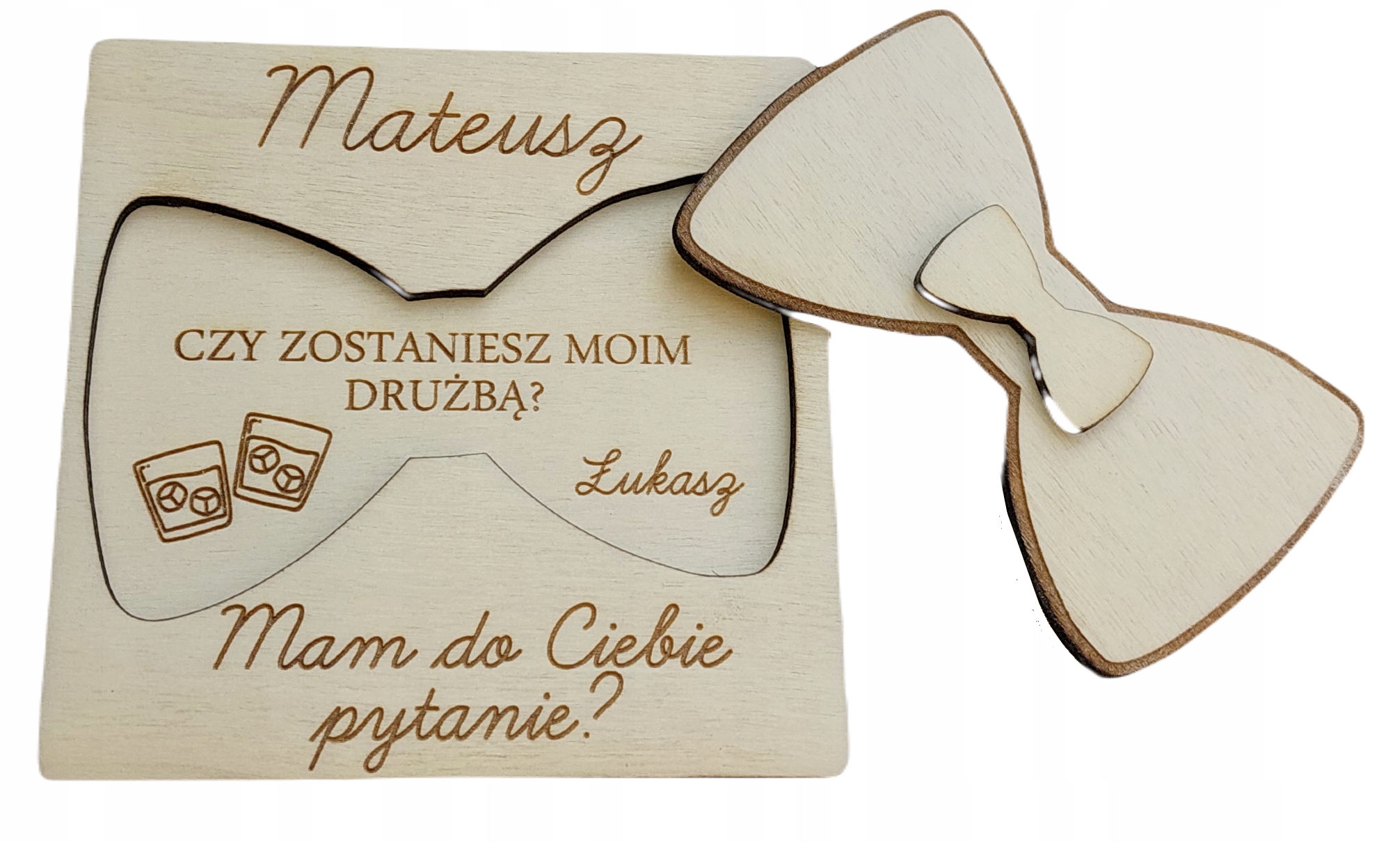- Бант деревянный, после чего выясняется, что появляется надпись: «ТЫ БУДЕШЬ МОИМ ЛУЧШИМ МУЖЧИНОЙ?» +имя жениха.