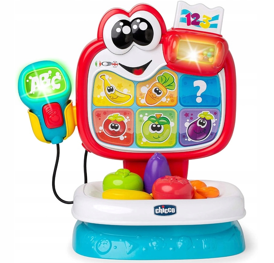 Современный сканер распознает фрукты и овощи, нанося его на продукты. Игрушка учит логическим комбинациям и взаимодействию с другими участниками игры.