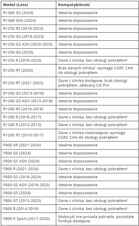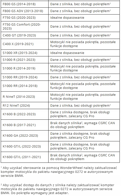 проверьте совместимость с AIO-5 для BMW с вашим мотоциклом (таблица ниже). Некоторые мотоциклы требуют дополнительных адаптеров для получения полной функциональности. h2>