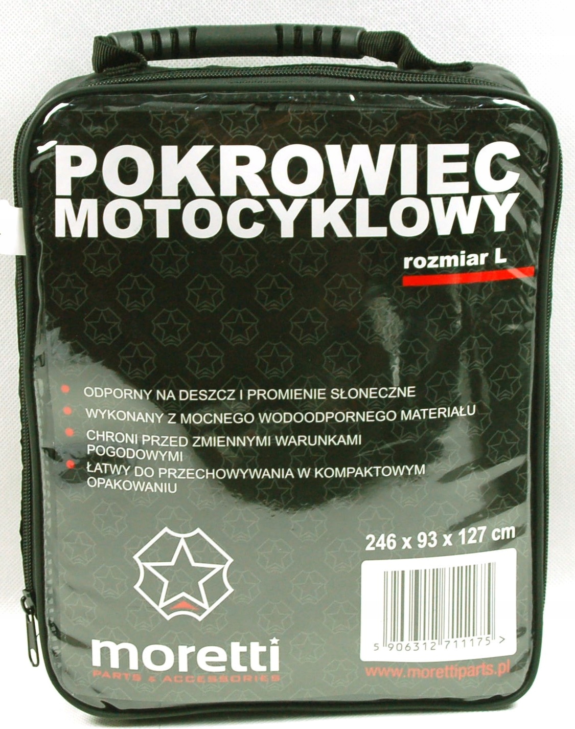 Высококачественный мотоциклетный чехол MORETTI из очень прочного материала, устойчивого к любым погодным условиям. В комплект входит чехол для чехла. Сделано так, что можно легко закрыть зеркалами весь мотоцикл.