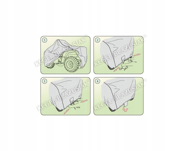 Инструкции по установке: Наденьте чехол на относительно чистый квадроцикл, затем очень сильно потяните съемник чехла и завяжите его должным образом в соответствии с инструкциями на упаковке.