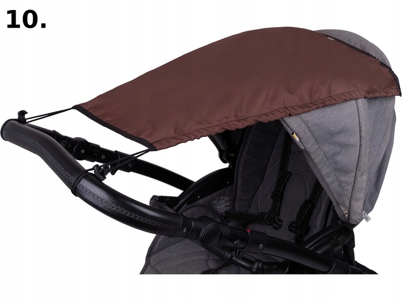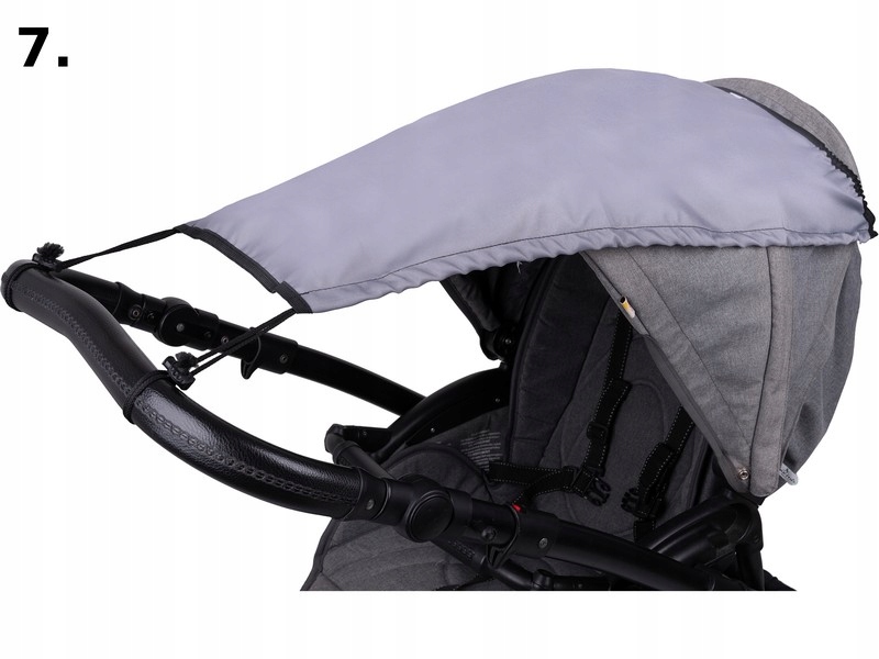 Навес крепится с помощью резинки, проходящей через него. Спереди он привязан двумя веревками к ручке коляски. Дополнительно козырек можно регулировать с помощью веревки и стопоров. В зависимости от угла падения солнечных лучей чехол можно сдвигать вбок, регулируя его с помощью веревочек и резинки.