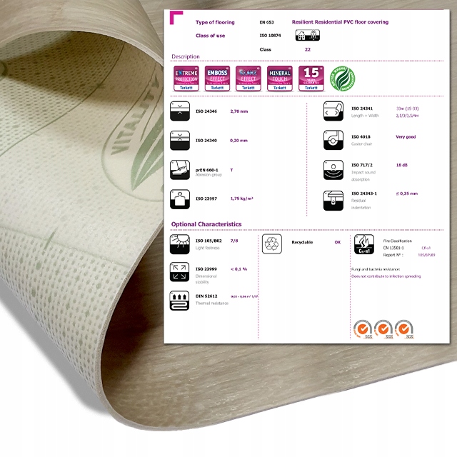 Эластичный коврик с рисунком, имитирующим деревянные панели. Пол изготовлен из поливинилхлорида, также известного как ПВХ. Это ковер, предназначенный для домашнего использования. Толщина предлагаемого ковролина 2,7 мм и слой износа 0,2 мм, предназначен для жилых помещений со средней проходимостью. Прочный - устойчив к вмятинам и перегибам, а также УФ-лучам.