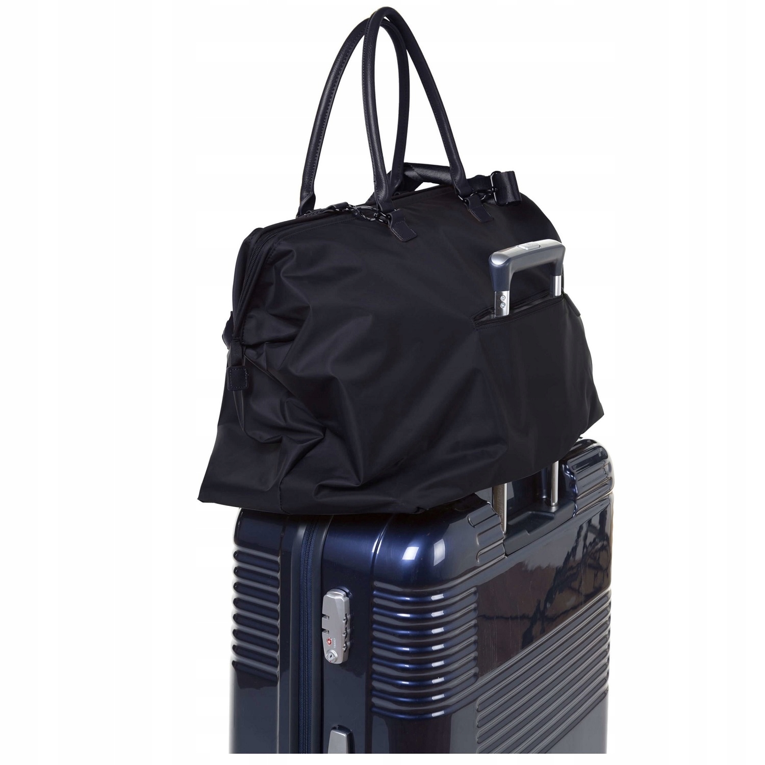 Снаружи имеется так называемая дорожный карман. Застегивается на молнию снизу и сверху. Когда оба открыты, сумку можно положить на ручку дорожного чемодана. Когда нижняя молния застегнута, она служит дополнительным внешним карманом.
