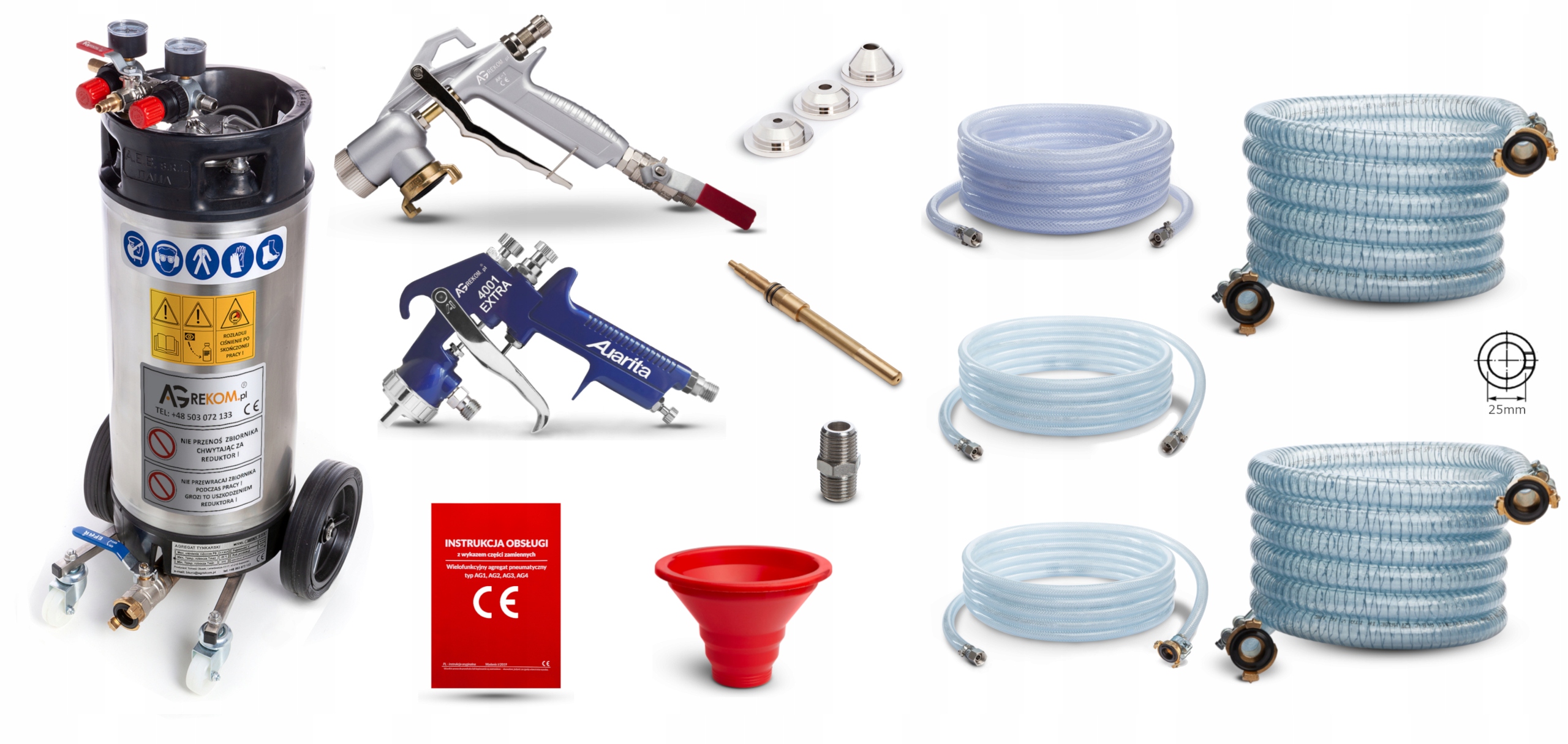 - 10 м армированный шланг с штуцерами для подачи воздуха к пистолетам,