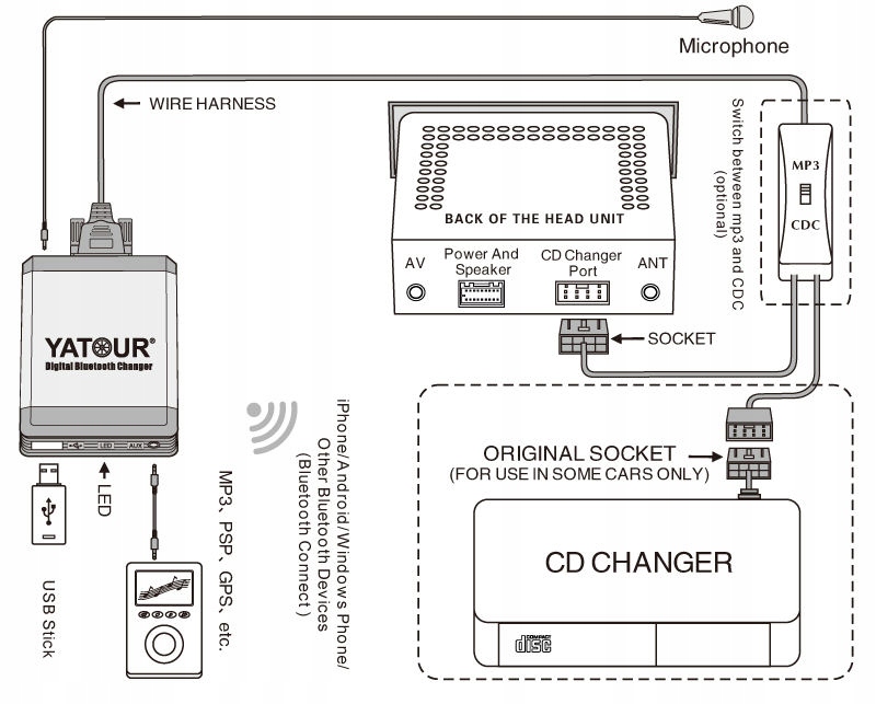 Новый комплект/чейнджер громкой связи от Yatour позволяет подключаться к плееру компании вместо стандартного чейнджера, совершать телефонные звонки и отправлять сообщения музыка через Bluetooth (протокол A2DP), с любых устройств, телефона, ноутбука, планшета и т.д.