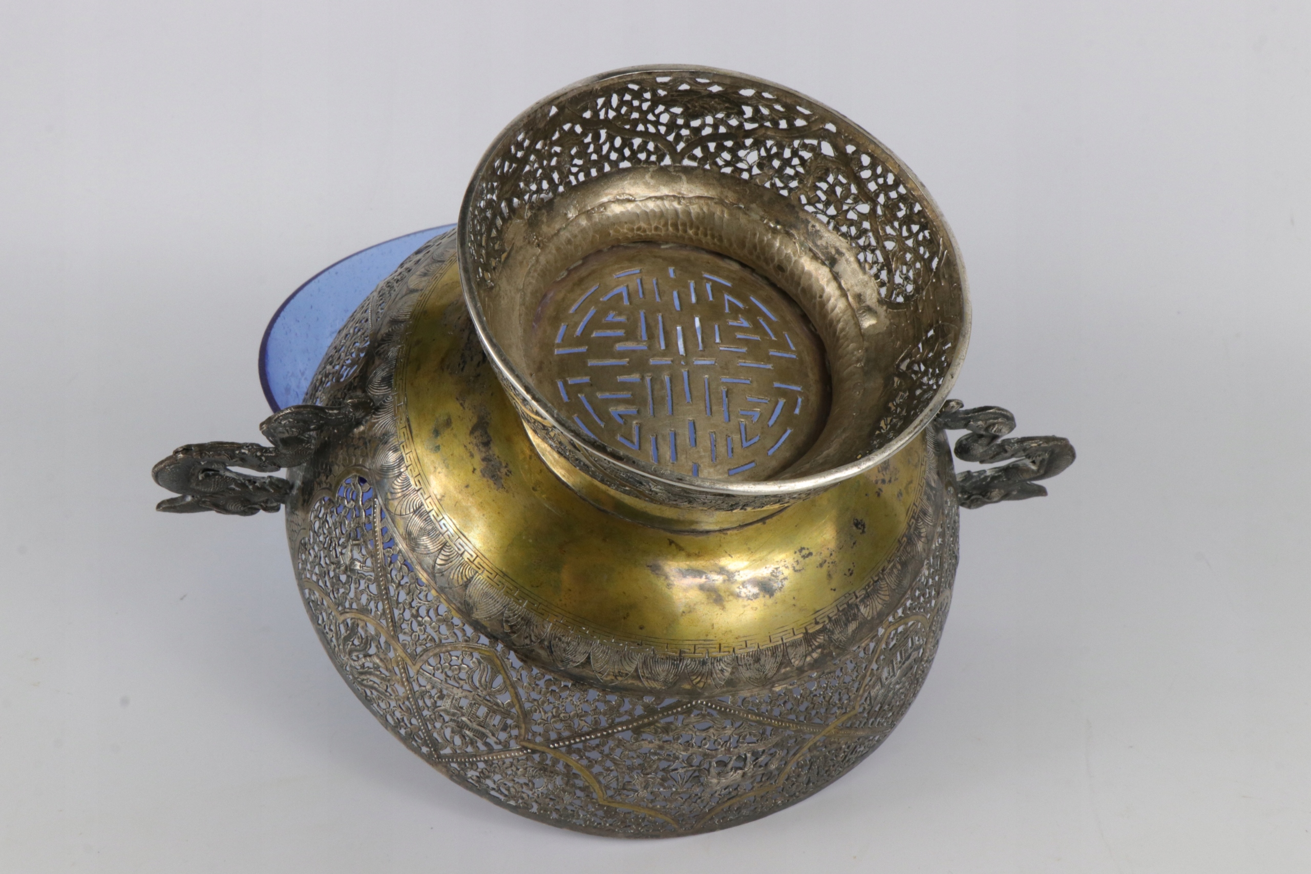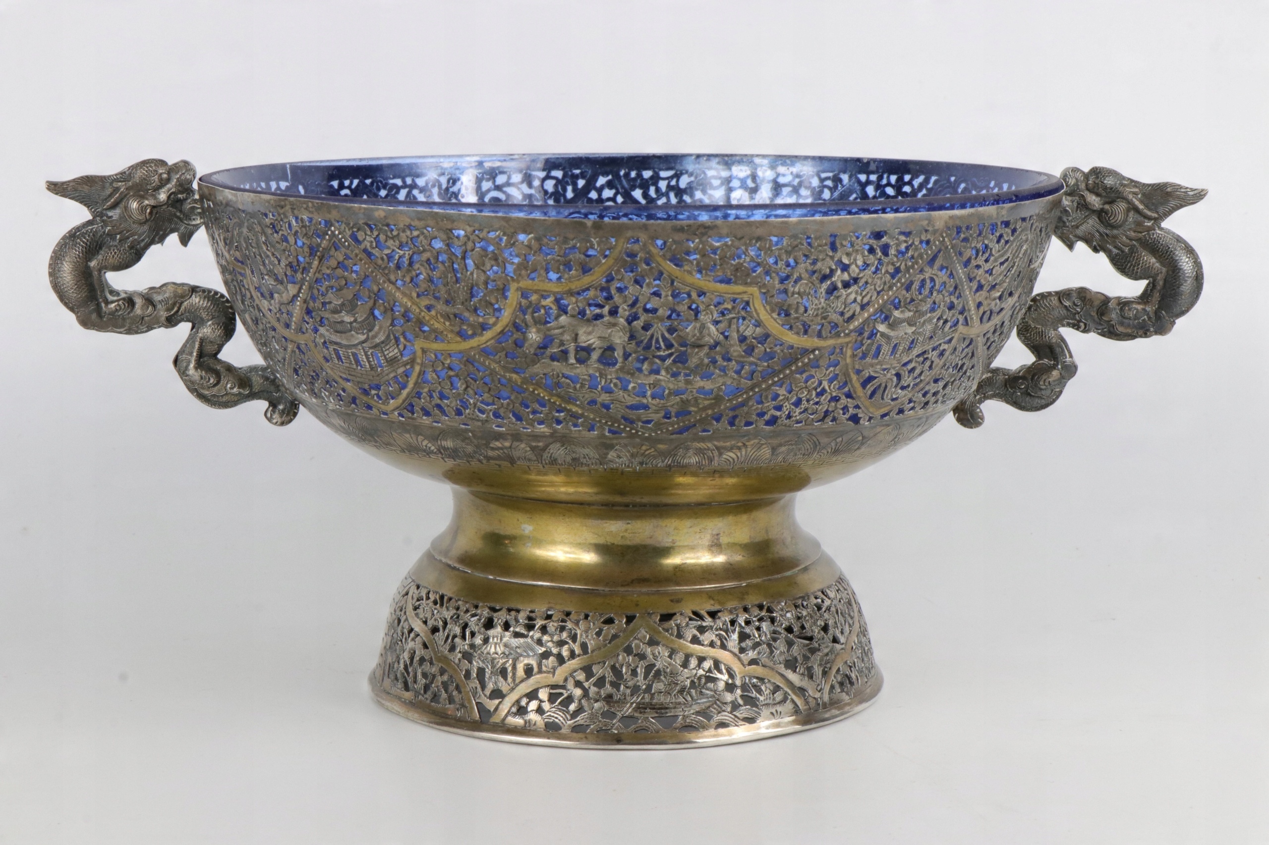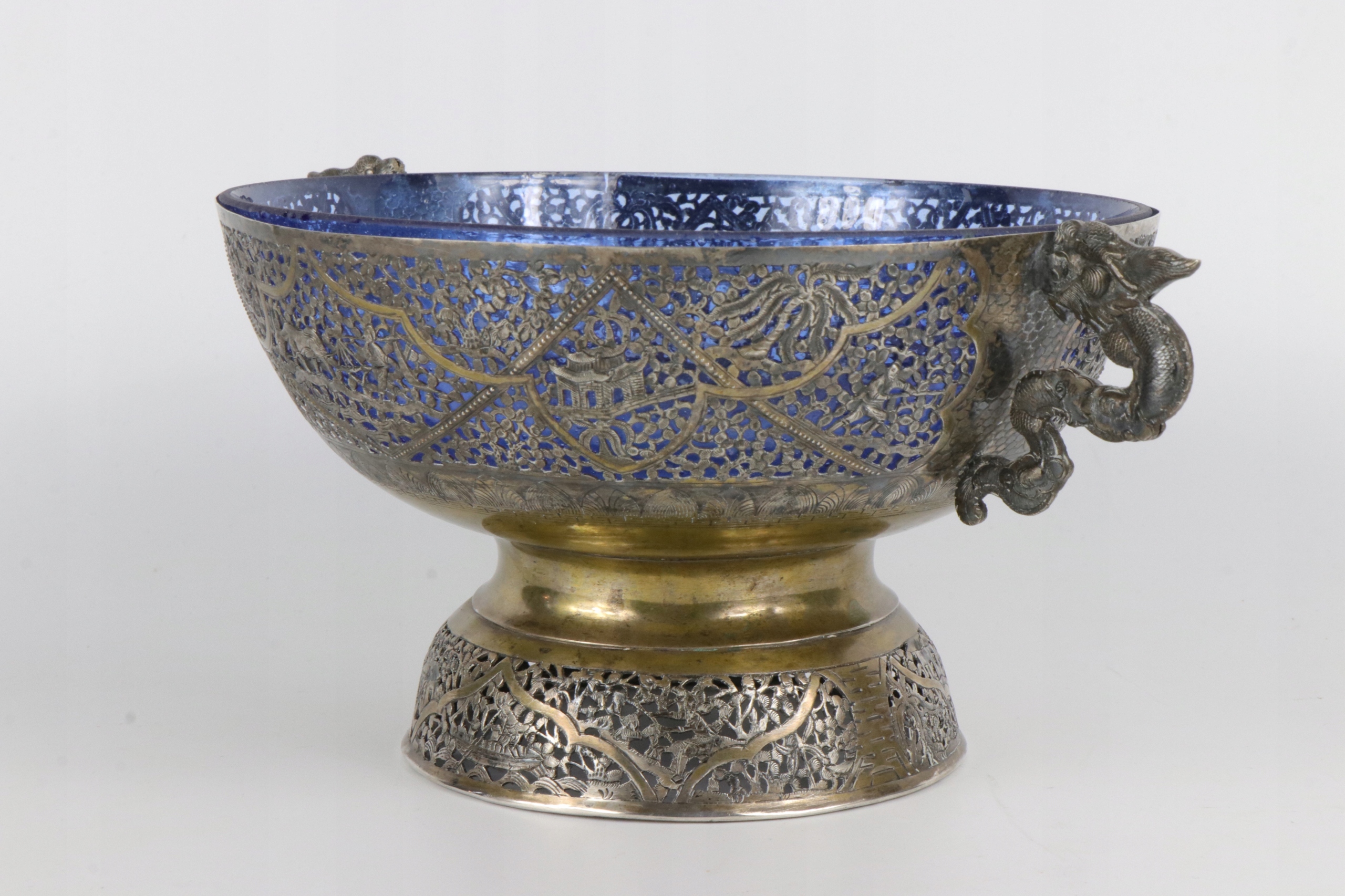 Очень интересная ажурная серебряная тарелка с очень богатым, сложно выполненным орнаментом. Ажурный орнамент с изображением рыбаков и традиционных китайских пагод. Вставка тарелки изготовлена из старого кобальтового стекла. Как хорошо видно на фотографиях, стекло изготовлено по старинным технологиям с огромным количеством пузырьков воздуха. Ручки в форме двух драконов. Серебро не подписано, но жидкость для тестирования серебра явно имеет красный оттенок. По моему мнению, тарелка 19-го или, возможно, конца 18-го века. Кованое серебро ручной работы.