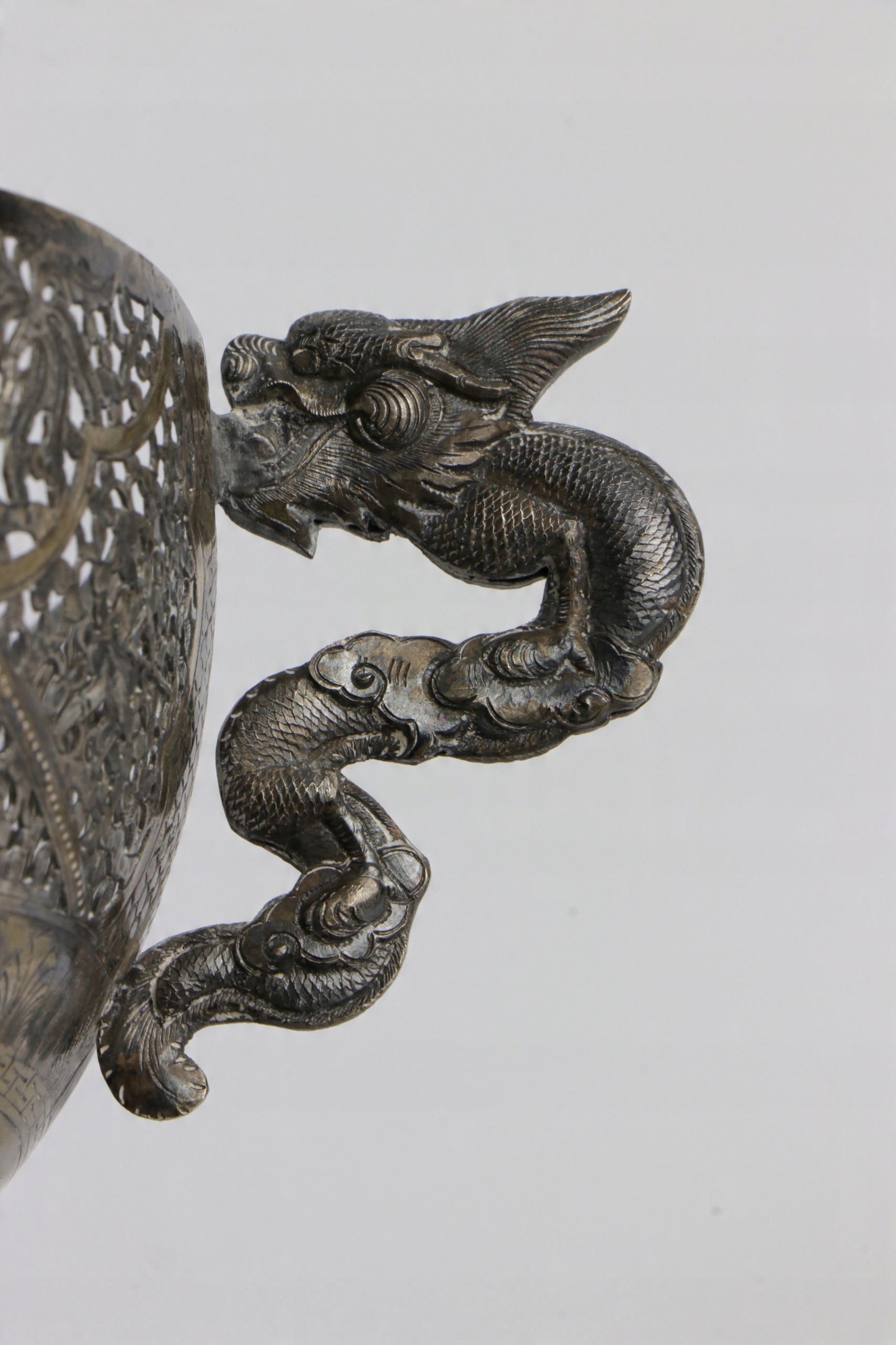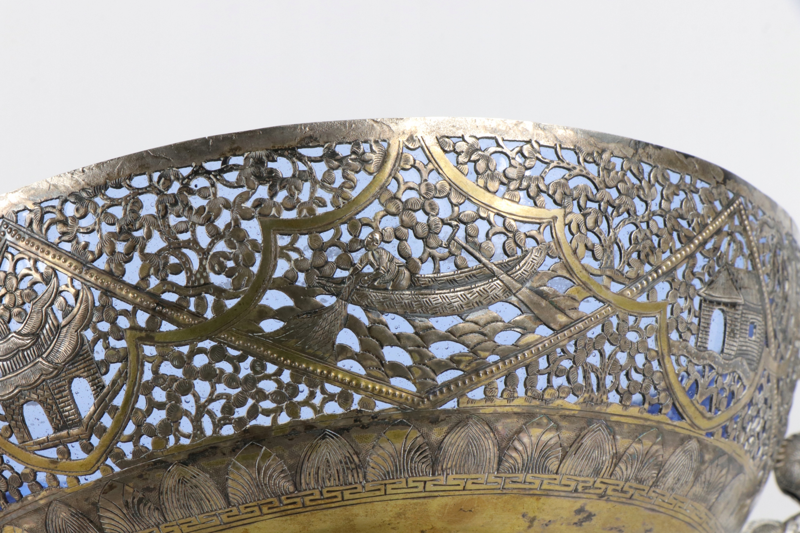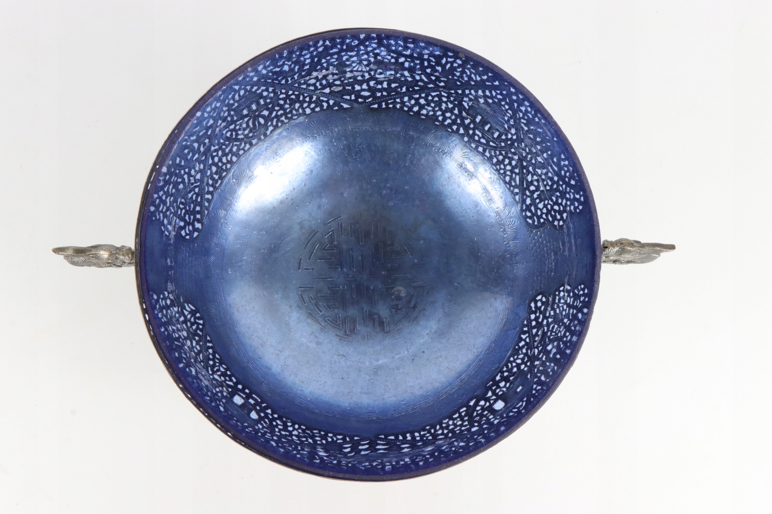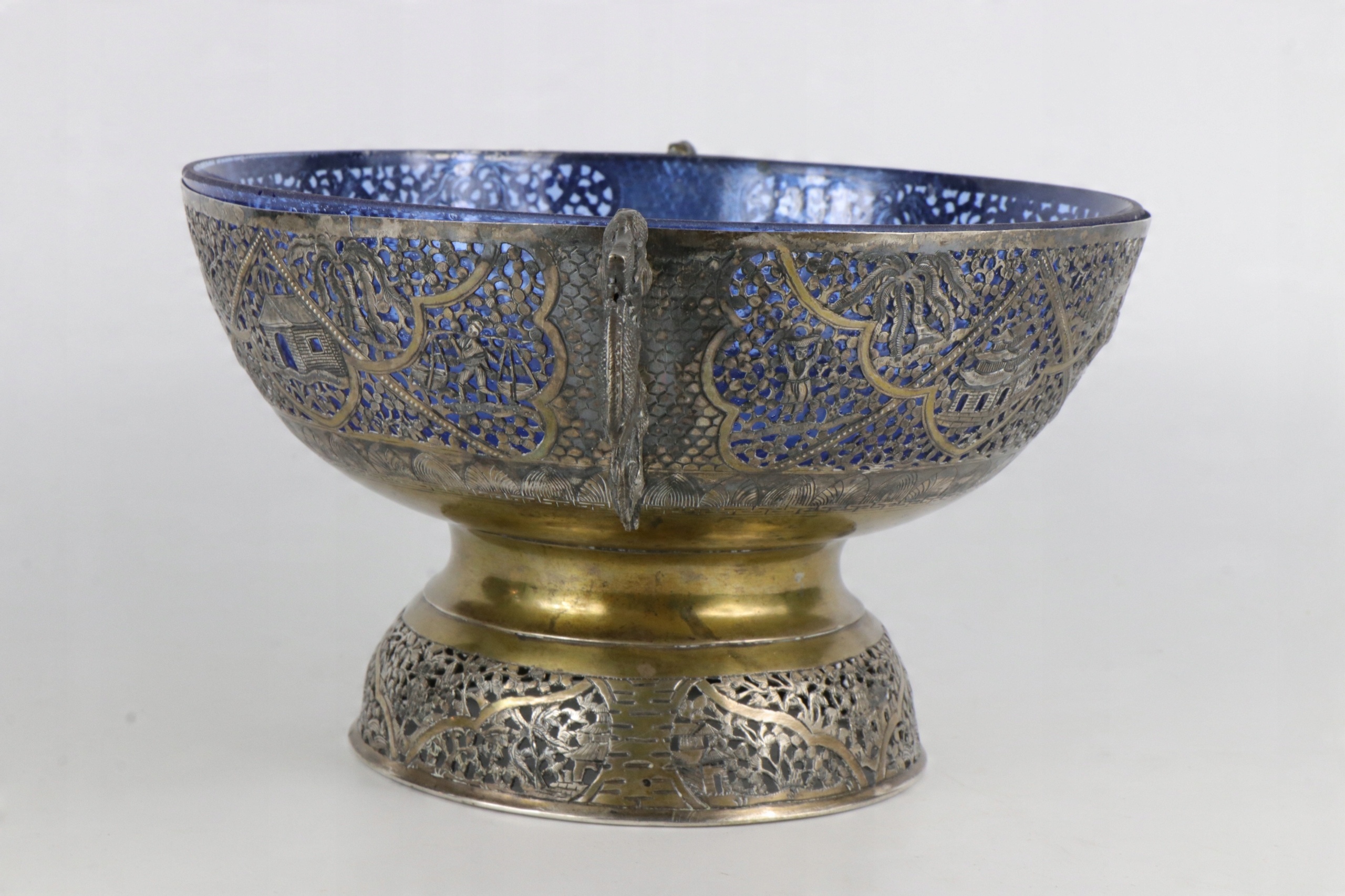 Очень интересная ажурная серебряная тарелка с очень богатым, сложно выполненным орнаментом. Ажурный орнамент с изображением рыбаков и традиционных китайских пагод. Вставка тарелки изготовлена из старого кобальтового стекла. Как хорошо видно на фотографиях, стекло изготовлено по старинным технологиям с огромным количеством пузырьков воздуха. Ручки в форме двух драконов. Серебро не подписано, но жидкость для тестирования серебра явно имеет красный оттенок. По моему мнению, тарелка 19-го или, возможно, конца 18-го века. Кованое серебро ручной работы.