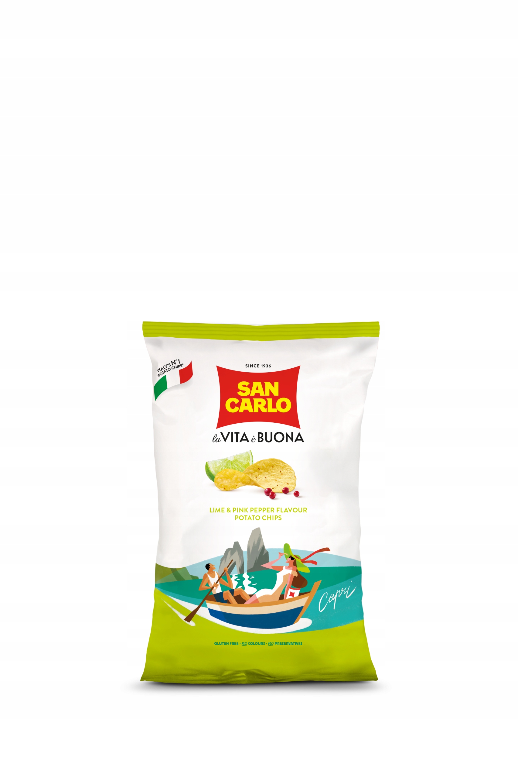 Чипсы с лаймом и розовым перцем - один из флагманских вкусов Сан -Карло - бренда чипсов в Италии. С одной стороны, захватывающий пряный, с другой, освежающий обновление. Плюс глазное, красочная упаковка, представляющая итальянский образ жизни в Капри. Настоящая красивая жизнь в стиле La Vita E Buona. Встречайте это и другие ароматы Сан -Карло