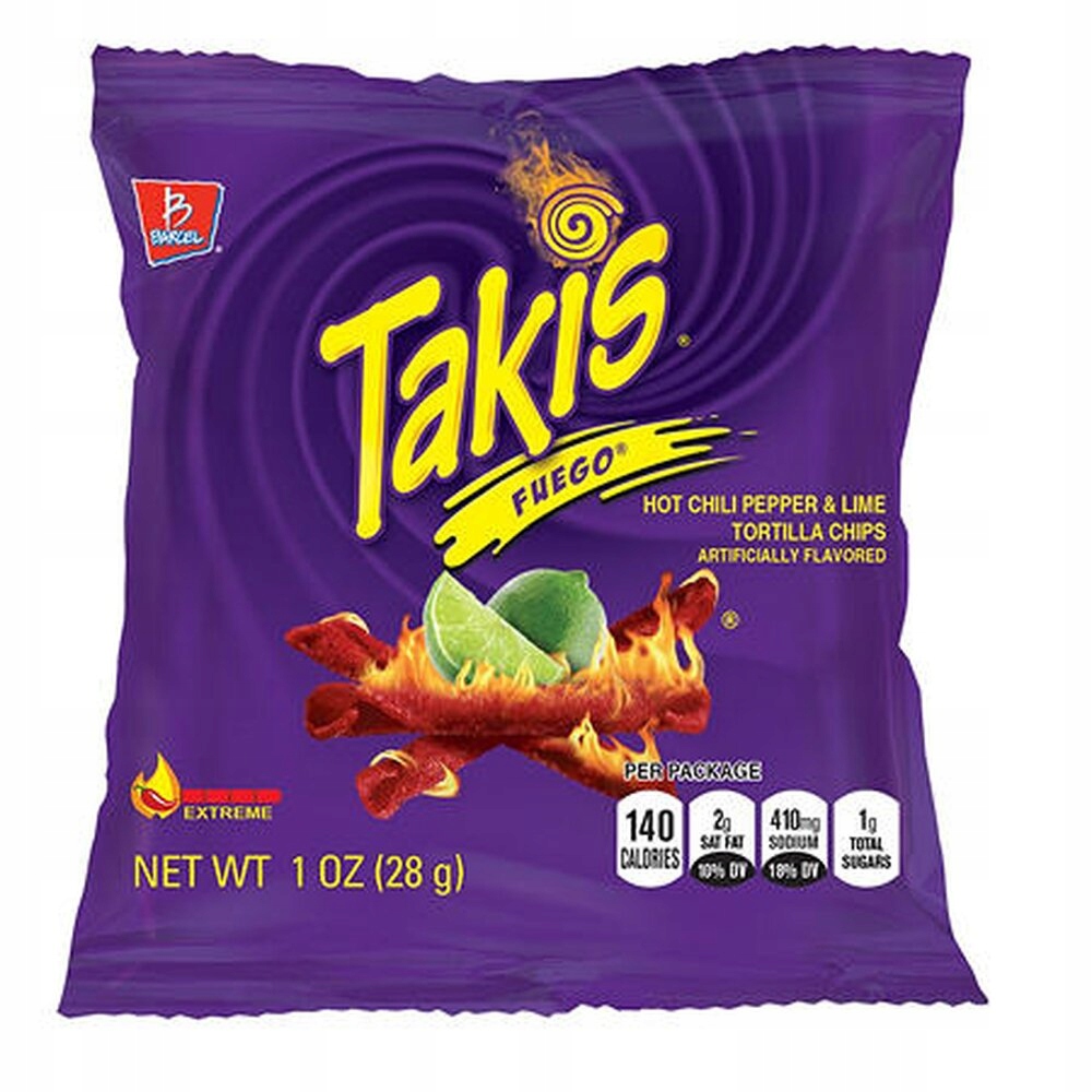 Такис Фуэго - острые кукурузные чипсы в форме свернутой лепешки со вкусом чили и лайма.