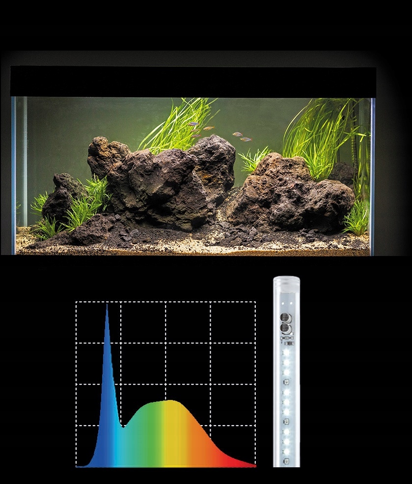 Высокий индекс цветопередачи Ra>80 в режиме ДЕНЬ подчеркивает естественные цвета рыб и растений. Благодаря современному светодиодному освещению, используемому в крышке, она потребляет до 65 % меньше энергии по сравнению с обычными люминесцентными лампами.