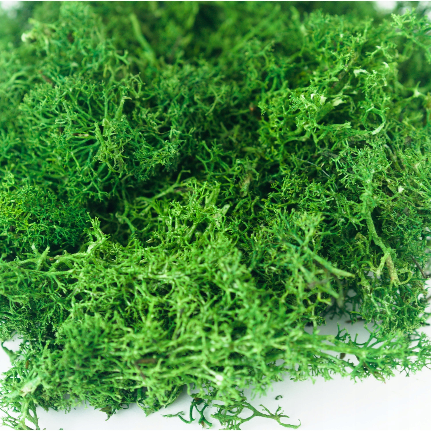 Мох Хроботек, натуральный, получен из шведских лесов. Мох очищен и содержит следы хвои. Растение пропитано постоянной пропиткой, а его зеленый цвет обеспечивается натуральным красителем.