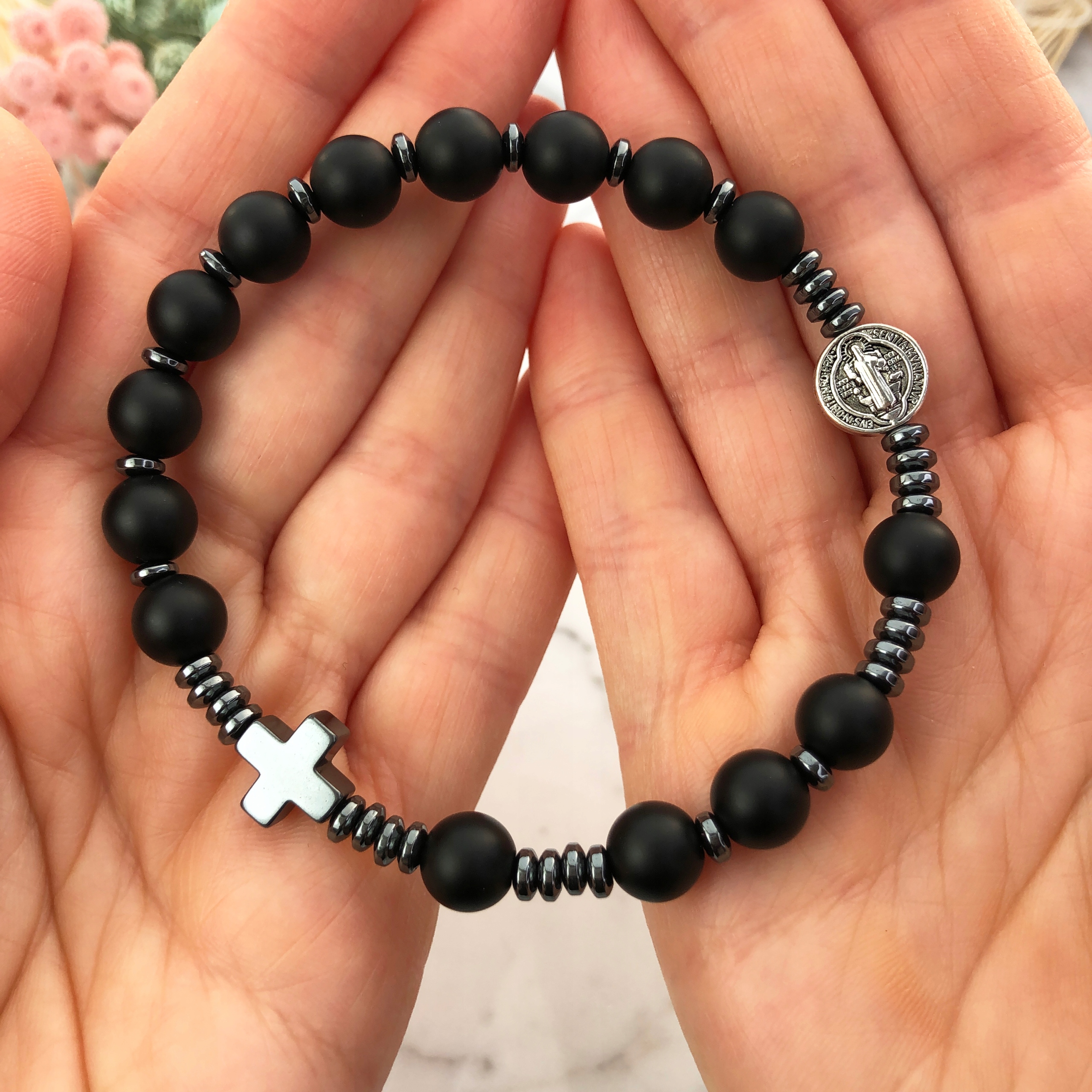 Браслет из натуральных декоративных камней - матового оникса и гематита с св. Бенедиктна прочной двойной силиконовой резинке.