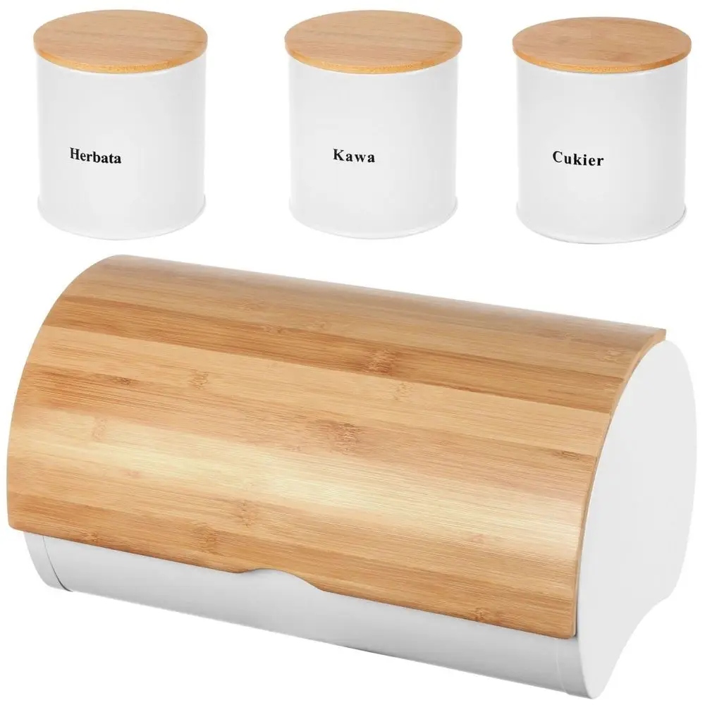 Современная форма хлеба, его привлекательная форма и сочетание белого металла с бамбуком прекрасно смотрятся на столешнице. Металлический корпус был поврежден, порошковая покраска еще больше повреждений и защита включена. В наборе 3 контейнера для кофе, чая и сахара.