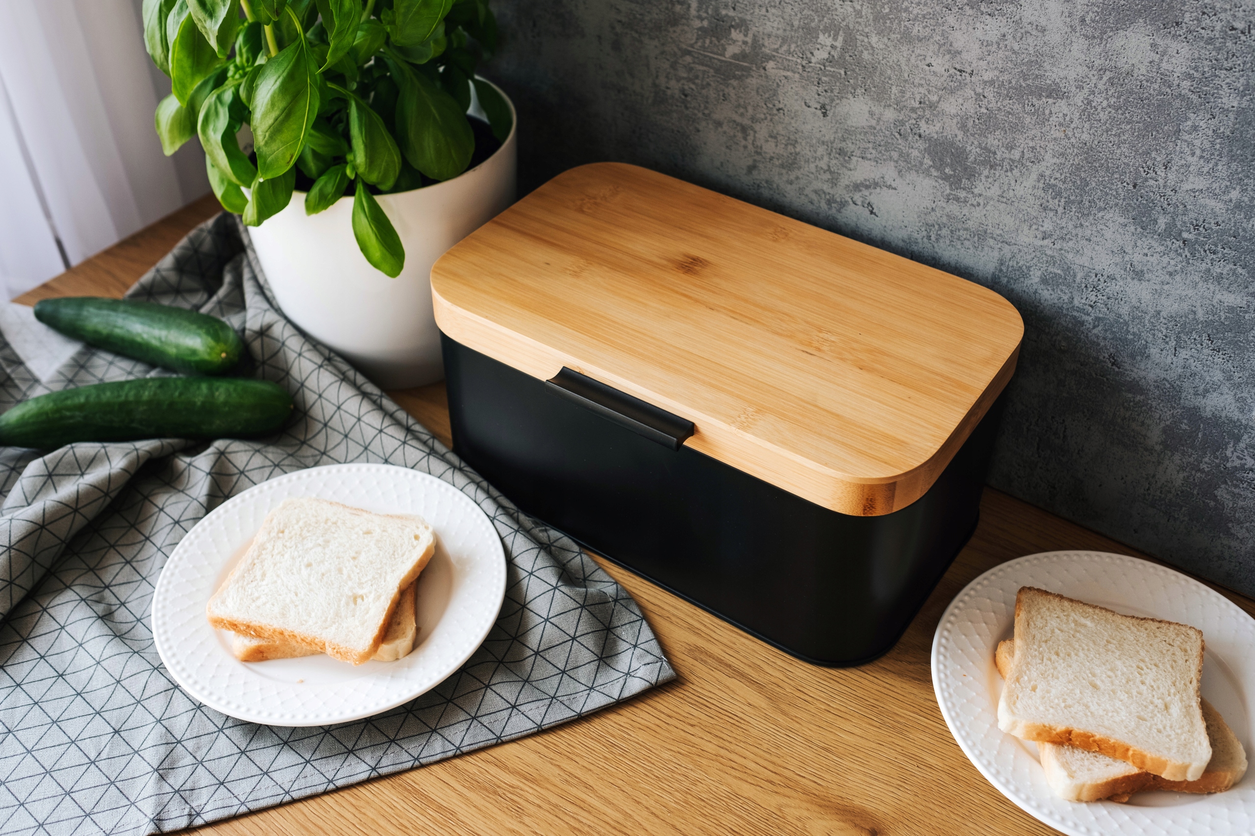 <ул>Хлебница открывается сверху и не занимает много места на кухонной стойке. Просто поднимите деревянную крышку, чтобы облегчить доступ к свежему хлебу.