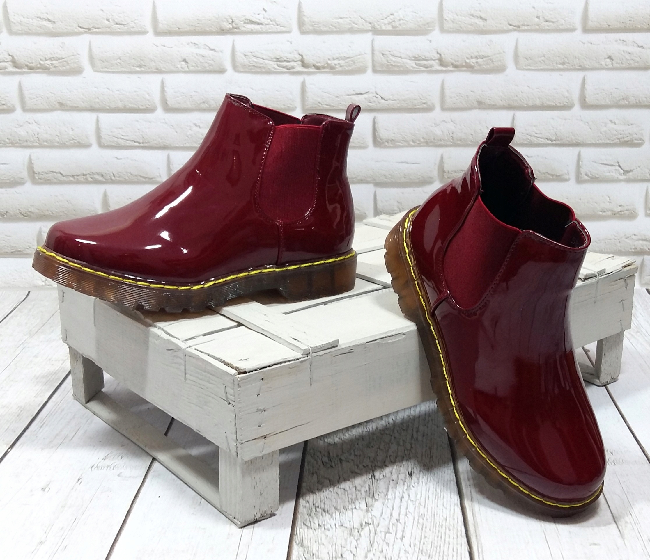 Из мягкой экологической кожи. Удобно надевать – достаточно вставить ногу. Контрастная желтая строчка в сочетании с резиновой подошвой и лакированным верхом придают ботинкам молодежный характер. Прекрасное дополнение весеннего образа.