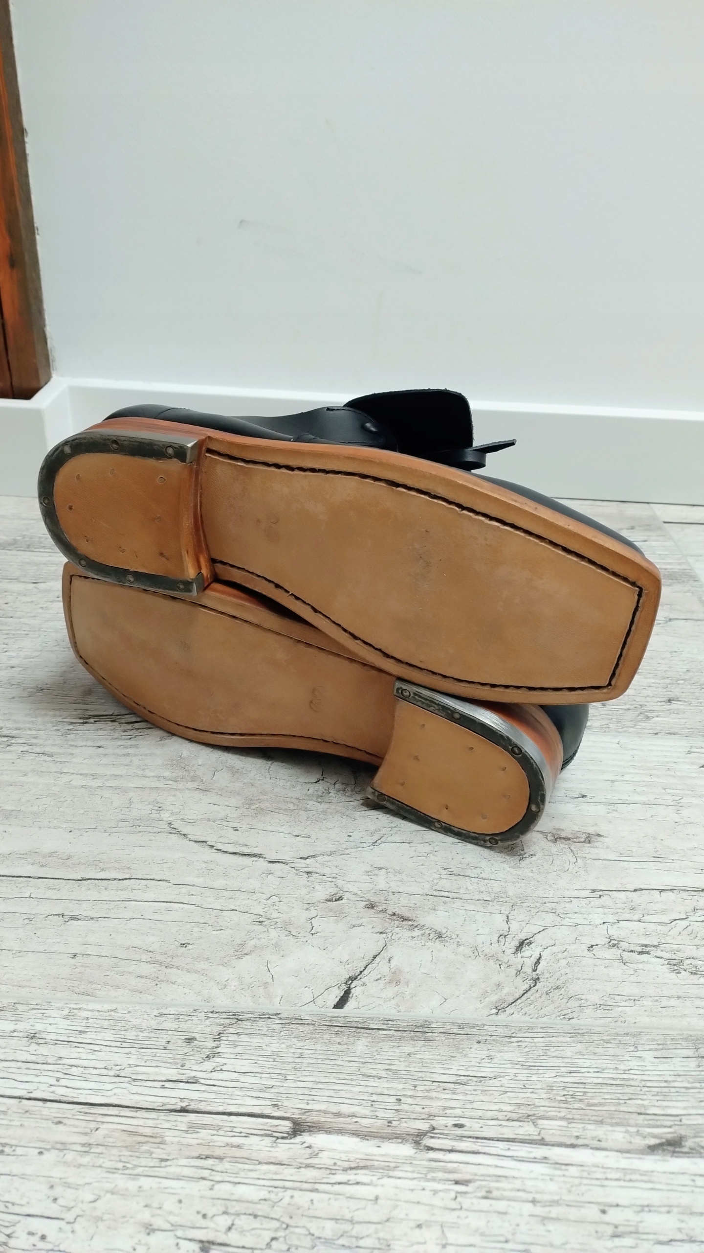 Полностью из кожи. Подошва пришита вручную, на каблуке стальные подковы.