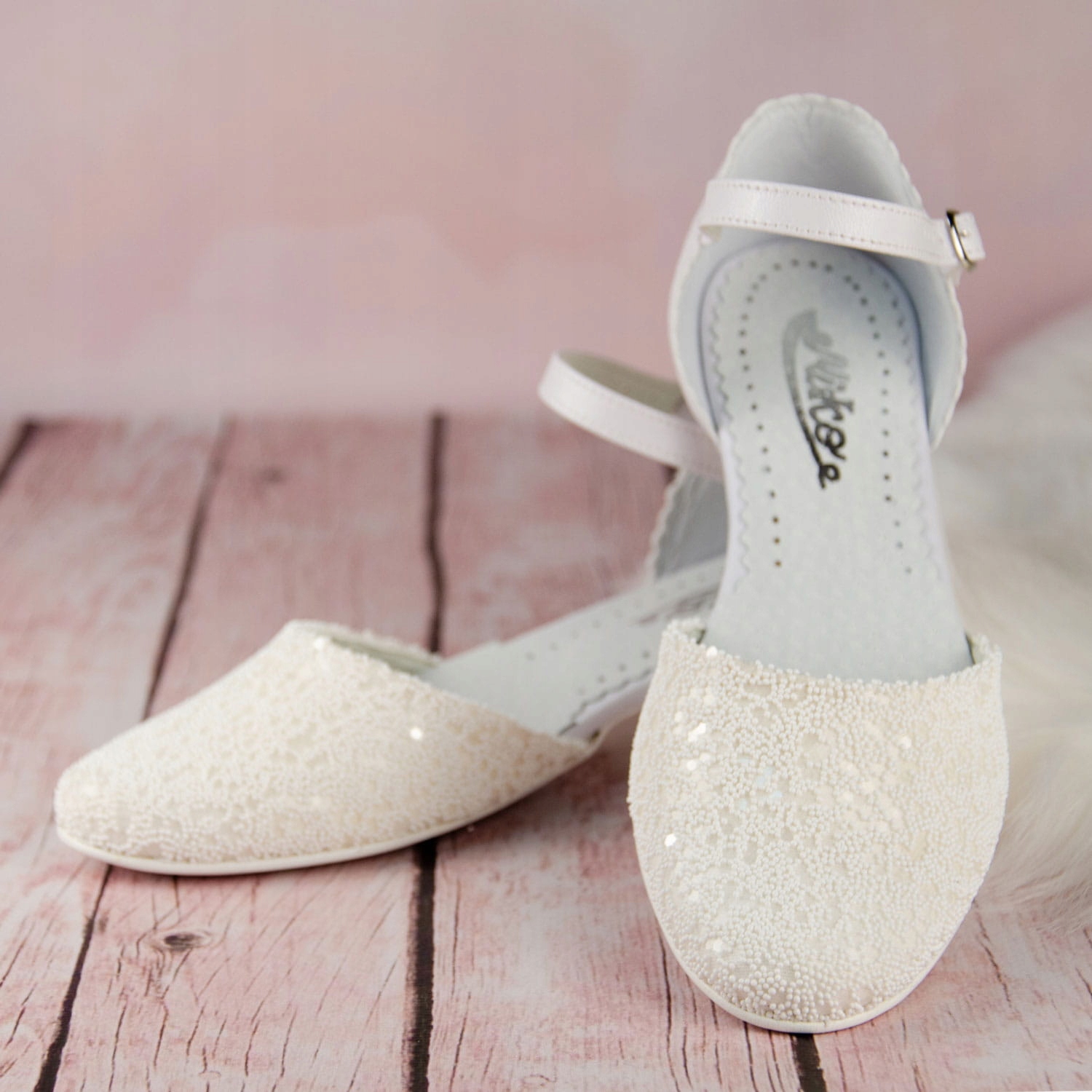 Элегантная, белая обувь для девушки, прикрепленная с регулируемым ремнем с пряжкой. Ну, обувь, благодаря которой они уверенно держатся на ногах. Модели на деликатном каблуке с высотой 2,5 см в белом. Декоративная передняя часть верхней, украшенной красивыми, маленькими бусинами, придает им очарование. Внешняя часть обуви состоит из экологической кожи, а пятка и вставка натуральной кожи. Обувь идеально подходит для большинства платьев из нашей коллекции.