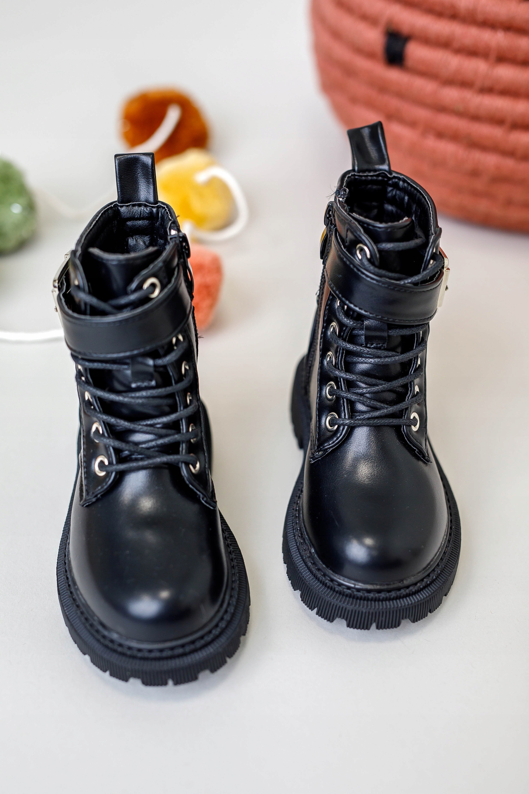 Туфли из экологической кожи. Внутри утеплен материалом, имитирующим мех. Туфли застегиваются на молнию и дополнительно шнуруются. Толстая подошва отлично изолирует от холода.