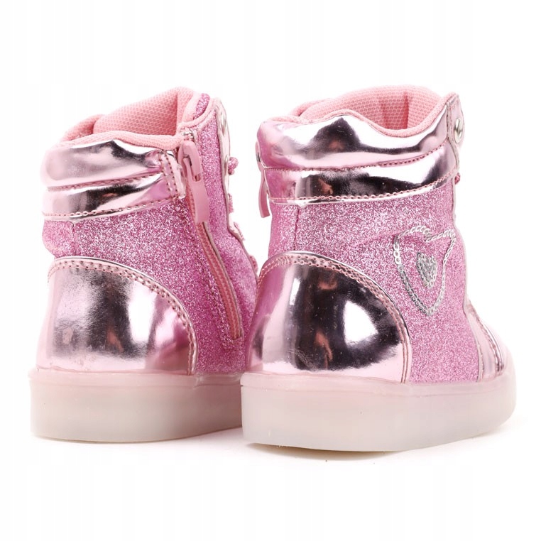 Кроссовки, туфли для девочек на плоской подошве. С верхним окончанием выше щиколотки. Сбоку украшено сердечком. Круглый лакированный нос. Изготовлен из блестящего материала в сочетании с лакированной кожей. Застегивается на молнию изнутри, спереди на шнуровке.