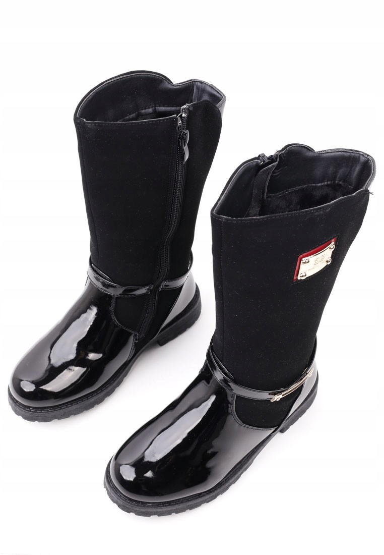 Сапоги для девочек на плоской подошве и протекторе. Верх выше колена. Изготовлен из экологической лакированной кожи в сочетании с замшей. Украшен узкой полоской вокруг щиколотки. Застегивается изнутри на молнию. Изолированный. Модные ботинки будут отлично смотреться с пальто.