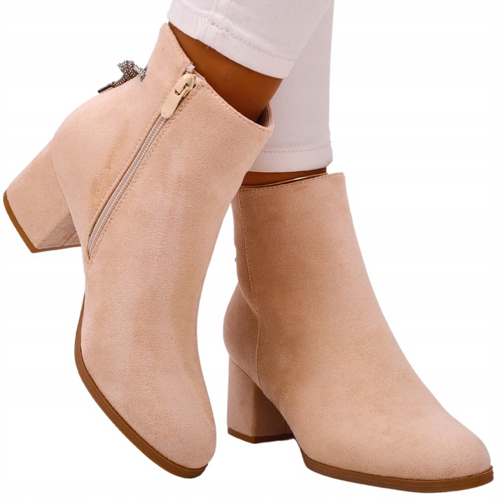 Женские бежевые ботильоны без шнуровки на высоком каблуке. Внутри подкладка из мягкого меха, что делает его удобным в использовании и идеально подходит для весны или осени. Они имеют застежку-молнию, что облегчает их надевание. Устойчивая толстая подошва хорошо амортизирует ногу. Изготовлен из материалов хорошего качества. Благодаря простому дизайну они подходят ко многим стилям.