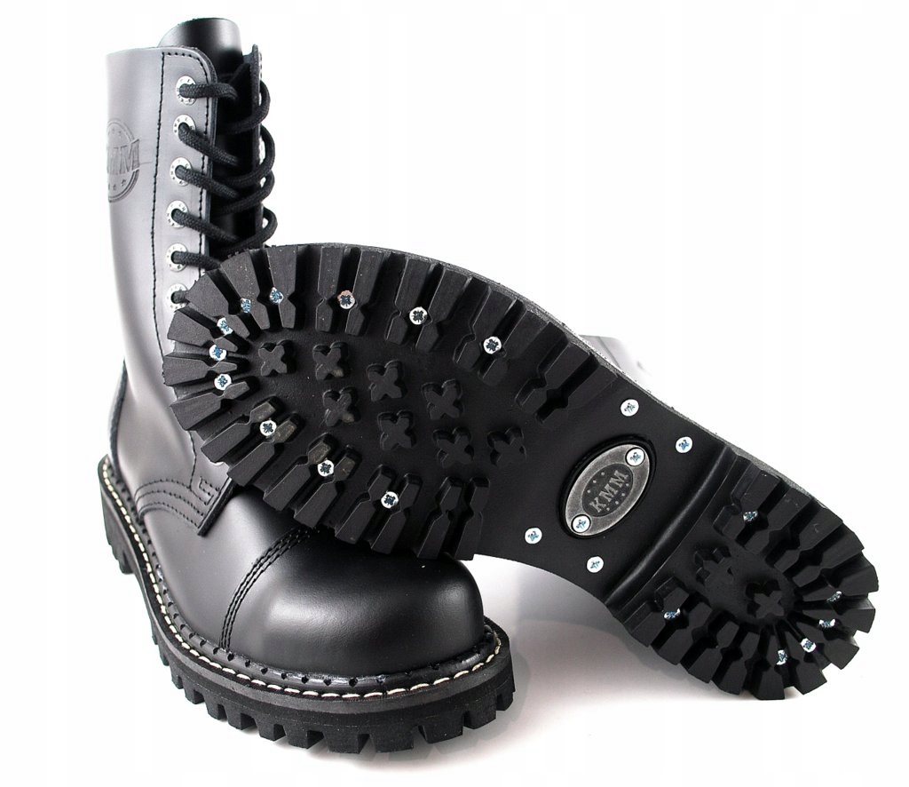 Классические ботинки КММ с 10 отверстиями из натуральной лицевой кожи. Подошва проклеена в три слоя для большей гибкости и устойчивости и имеет нескользящий рисунок протектора. Носки обуви усилены стальными носками.