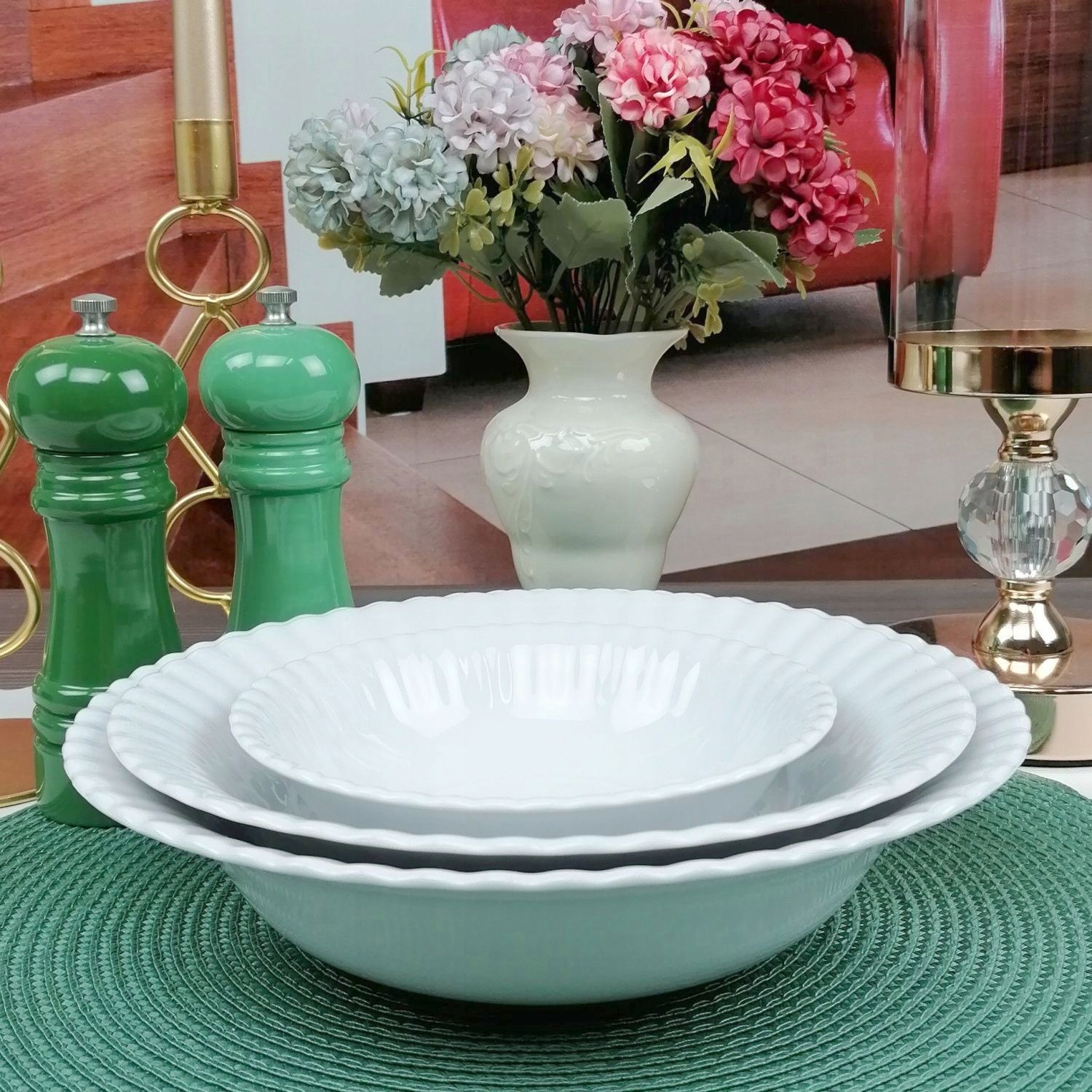 Коллекция включает в себя множество практических сосудов, таких как бульоны, уксус и бутылки с маслом, а также различные салатные миски и блюда.