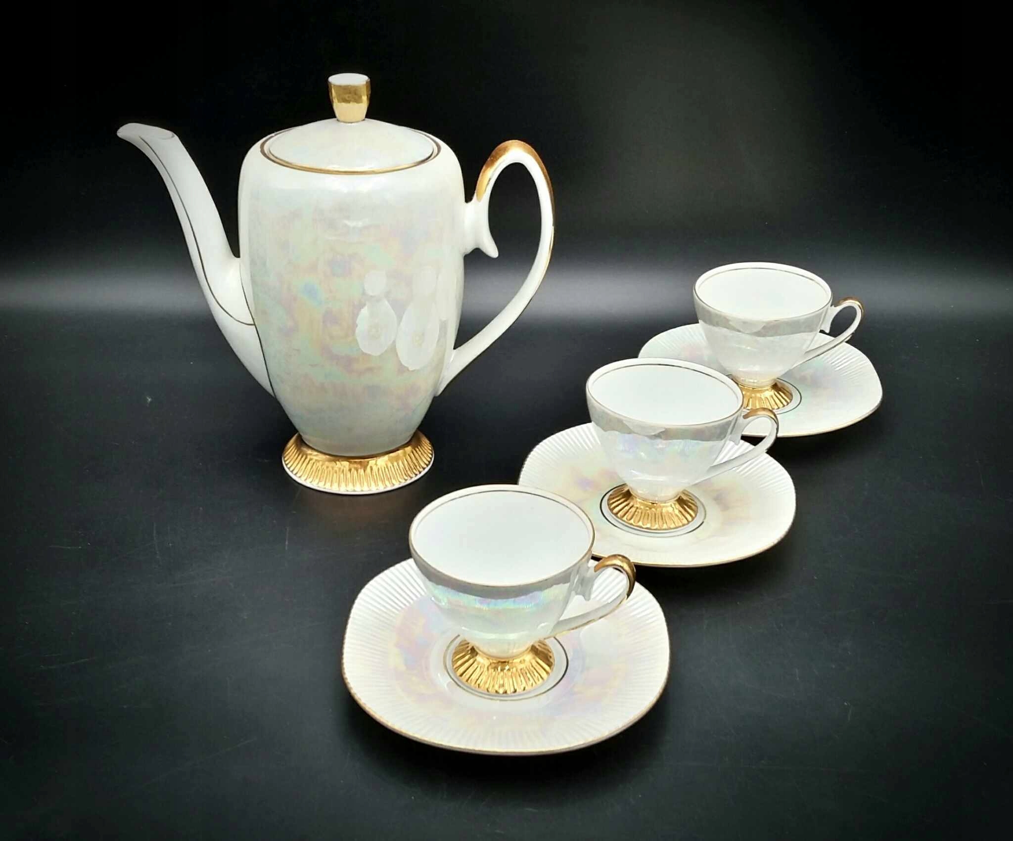 Регина из Ходзежа - кувшин и три чашки жемчужного бензина с позолотой. Высота кувшина 19,5 см, максимальный диаметр блюдец 13,4 см, высота чашек 6 см. Все чашки в очень хорошем состоянии, у кувшина есть дефект на внутренней части фланца (он закрыт крышкой и незаметен). Позолота в отличном состоянии. Пожалуйста!!!