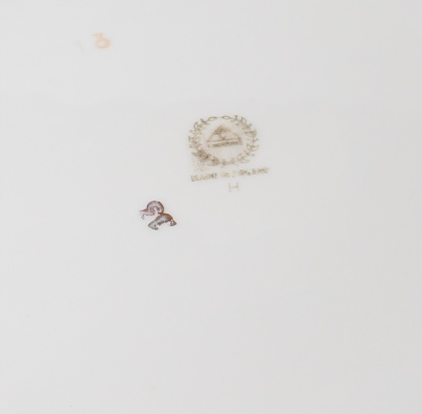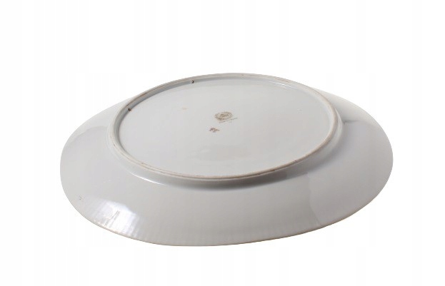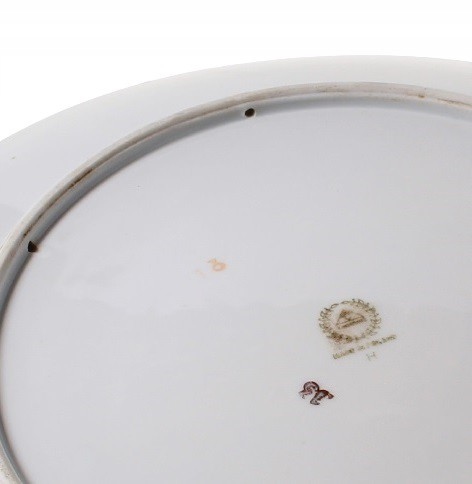 Позолота и яркие цветы на поверхности имеют локальные потертости. Также на поверхностях имеются царапины от эксплуатации и точечная потертость примерно 3 мм в центре поверхности большой пластины. Никаких трещин и сколов. По краю основания большой тарелки имеются два отверстия для струны. На основании большой пластины имеется потертость подписи.