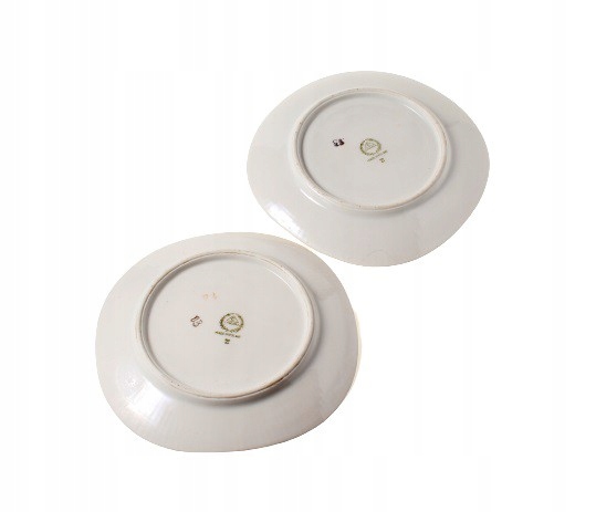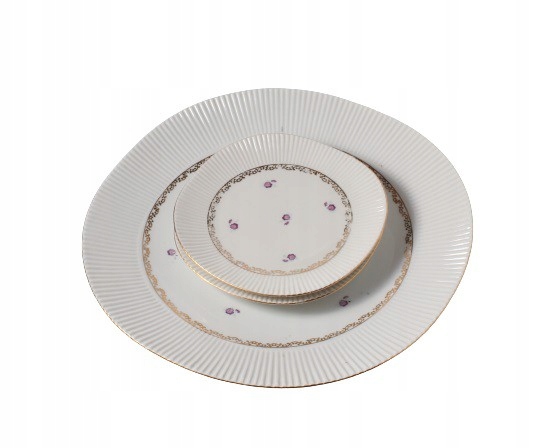 Три десертные тарелки из позолоченного фарфора (1 большая и 2 маленькие). Они происходят с Фарфоро-фарфорового завода в Ходзеже, Великопольское. Стиль «Регина». 1960-е годы