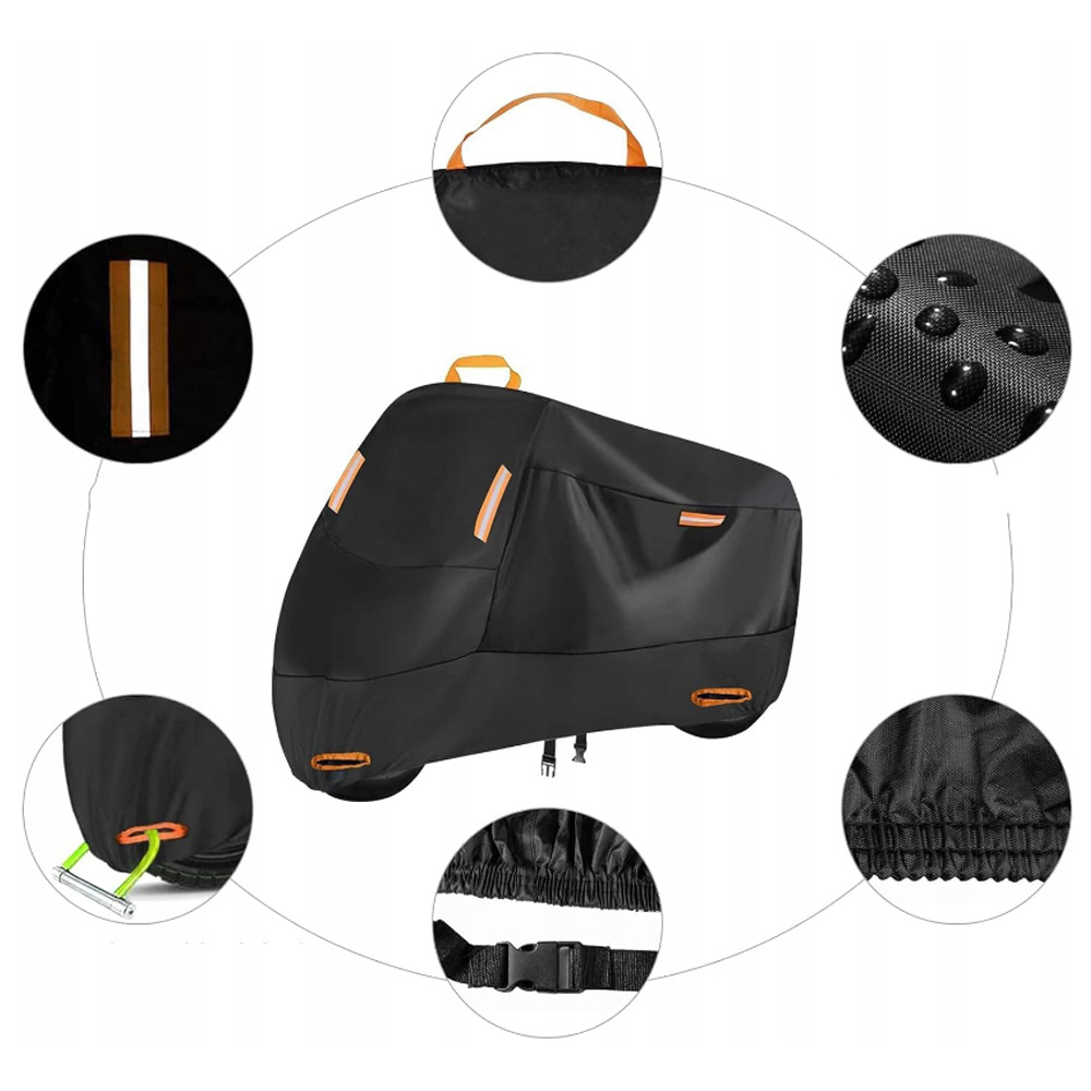 Наш чехол для мотоцикла изготовлен из высококачественной ткани 210D, которая обладает исключительной водонепроницаемостью. Этот чехол защитит от дождя, снега, пыли и птичьего помета, гарантируя, что ваш мотоцикл останется в идеальном состоянии независимо от погоды.