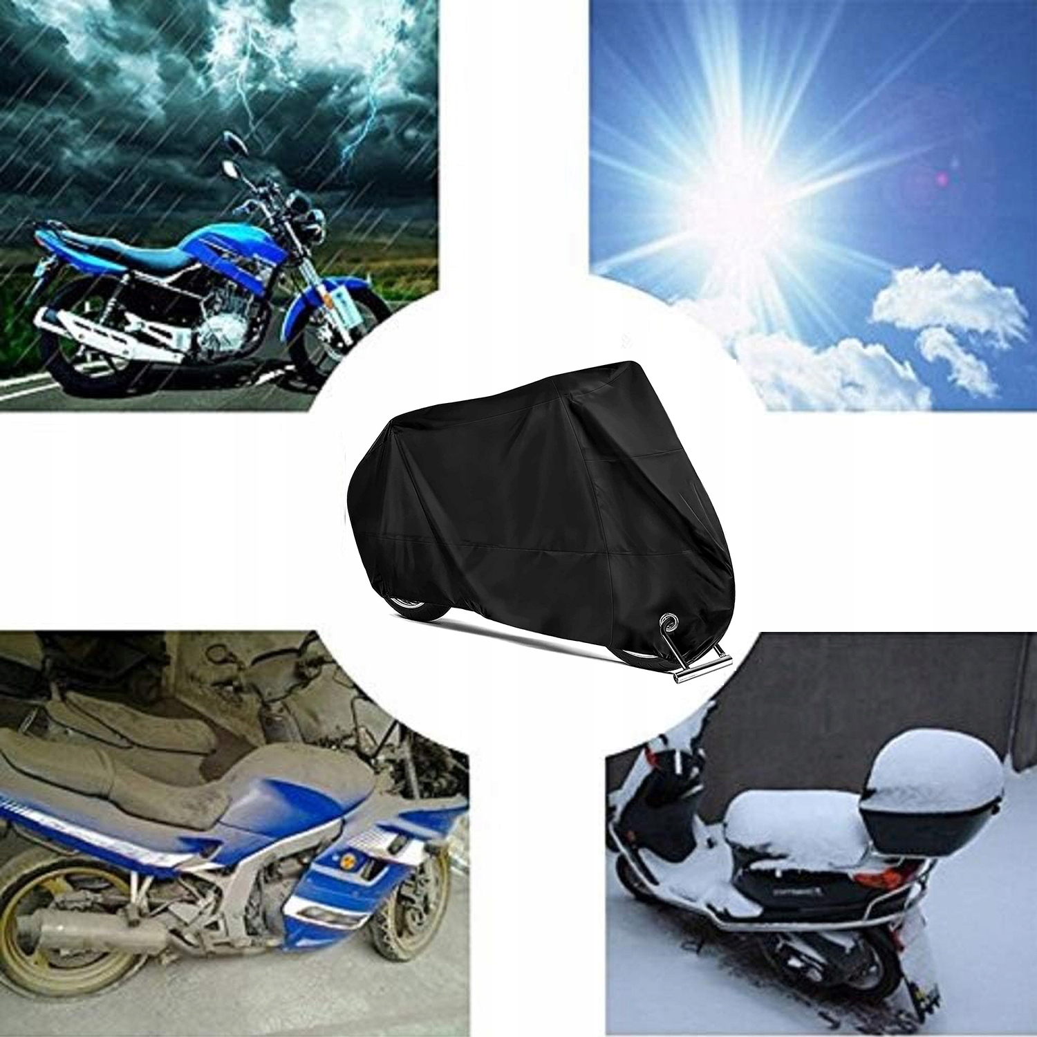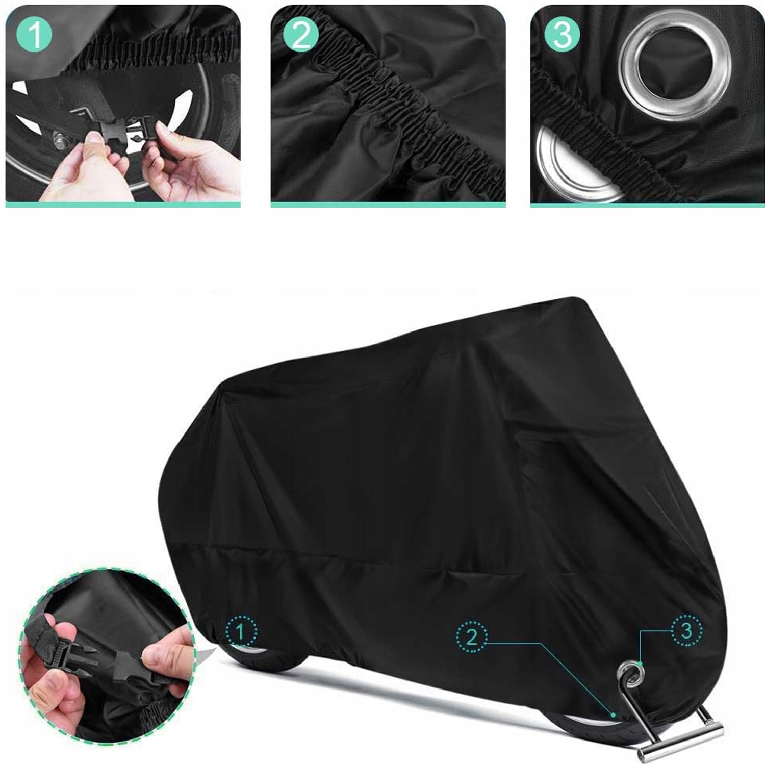 - Чехол мотоцикла изготовлен из прочной ткани Оксфорд 190T, которая обеспечивает эффективную изоляцию, защиту от ультрафиолета и водонепроницаемость. Он может защитить от неблагоприятных погодных условий, таких как дождь, снег, лед, ветер, пыль и солнце.