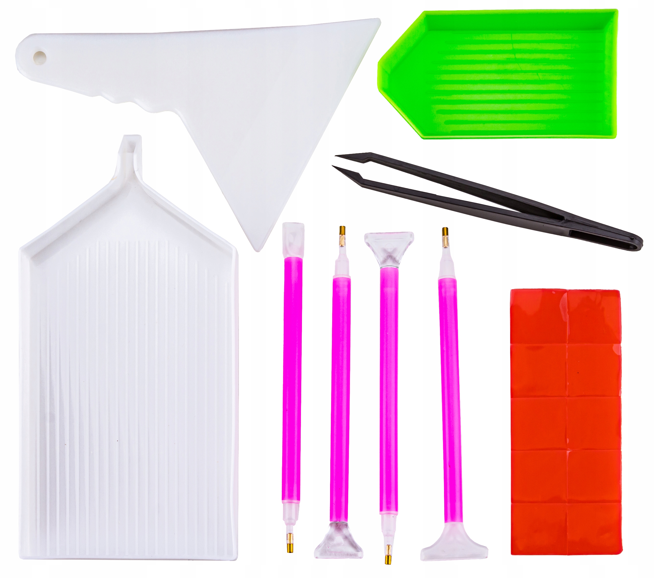 Большой набор дополнительных аксессуаров для алмазной вышивки, состоящий из множества полезных элементов. С этим набором склеивание бриллиантов станет проще и приятнее.