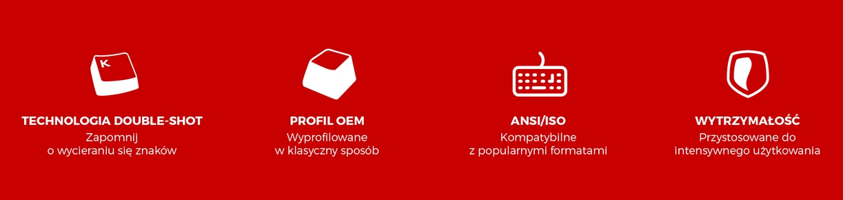 Каждая из клавиш выполнена в технике двойного впрыска непосредственно в форму клавиши (Double - выстрел), что, в отличие от традиционного метода выжигания знаков (лазер - резка), делает их исключительно устойчивыми к трению.