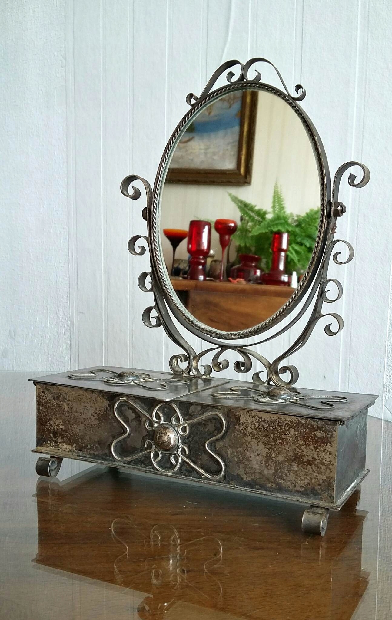Шкатулка для драгоценностей с зеркалом из глубокой Польской Народной Республики. Дизайн явно отсылает к стилю продукции ORNO и Rytosztuka. Знак МЕТ представлен на одной из фотографий. Высота 21см. Состояние видно на фотографиях - одно из зеркал (а их два) потускнело. Вероятно, внутренняя часть коробки была облицована материалом, которого сейчас нет. В остальном никаких недостатков. Пожалуйста.