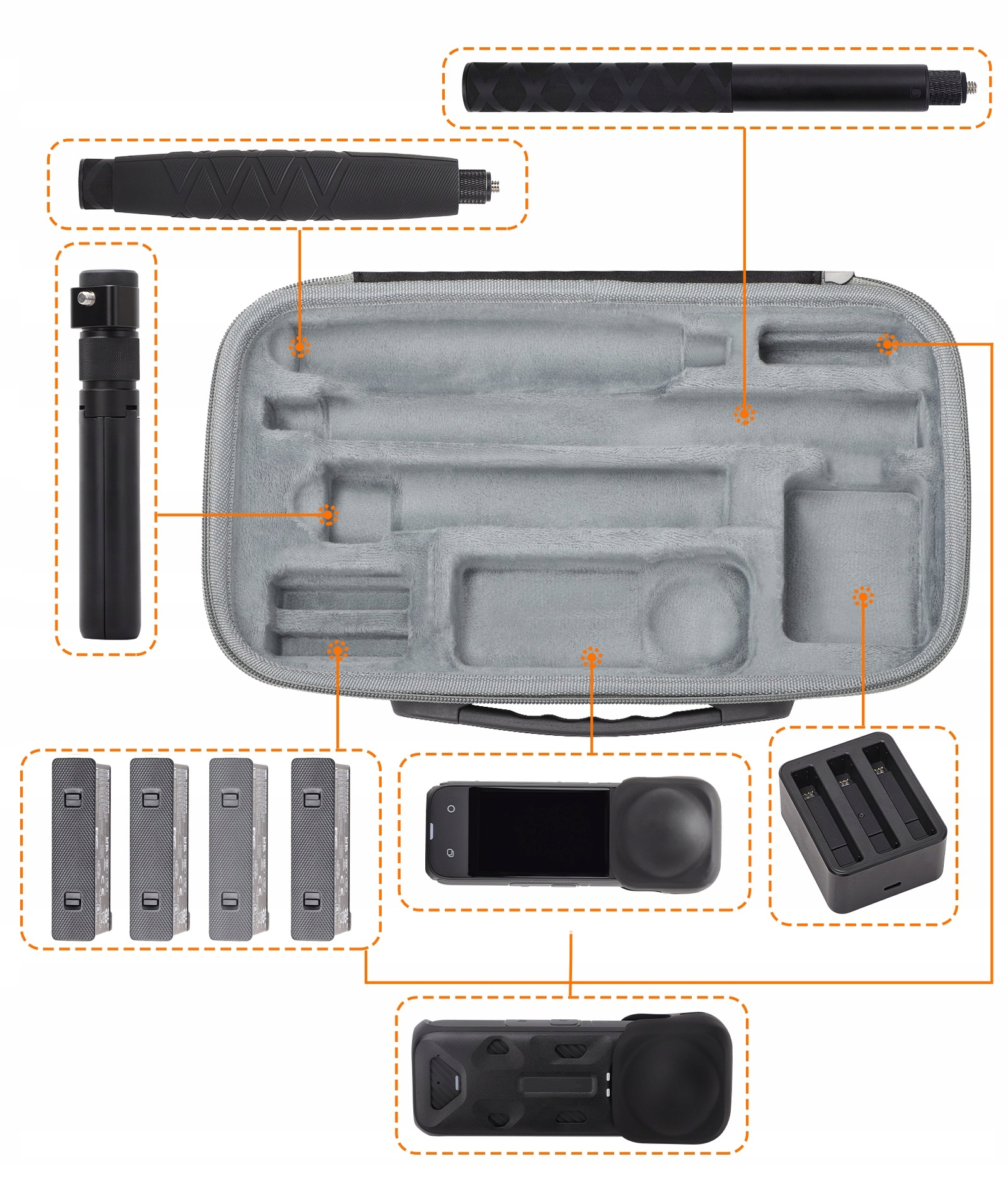 В чехле есть специальное место для камеры и дополнительных аксессуаров, таких как ручка, палка для селфи, аккумуляторы, зарядное устройство, кабели, фильтры и т. д.
