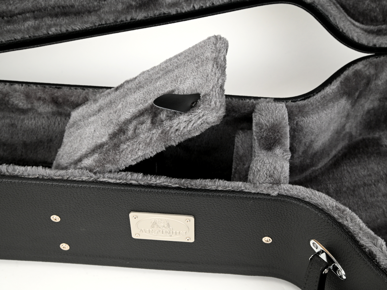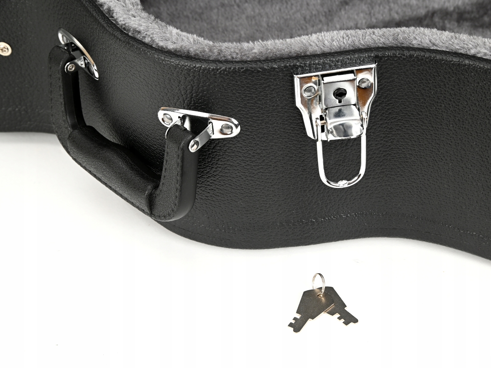 Корпус изготовлен из деревянной фанеры, обтянутой тканью под кожу по краям. снаружи. Внутри на подкладке из губки и плюша. Ориентировочный вес 4,7 кг. Кейс гитары оснащен пластиковой ручкой и четырьмя замками, один из которых ключевой. Доступны пять цветовых версий. Внешние размеры кейса для 6- и 12-струнной акустической гитары дредноут: 114,5см х 47см х 17,5см.