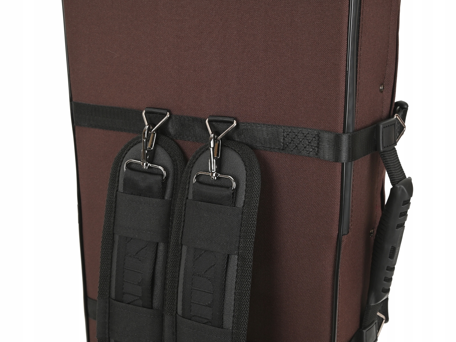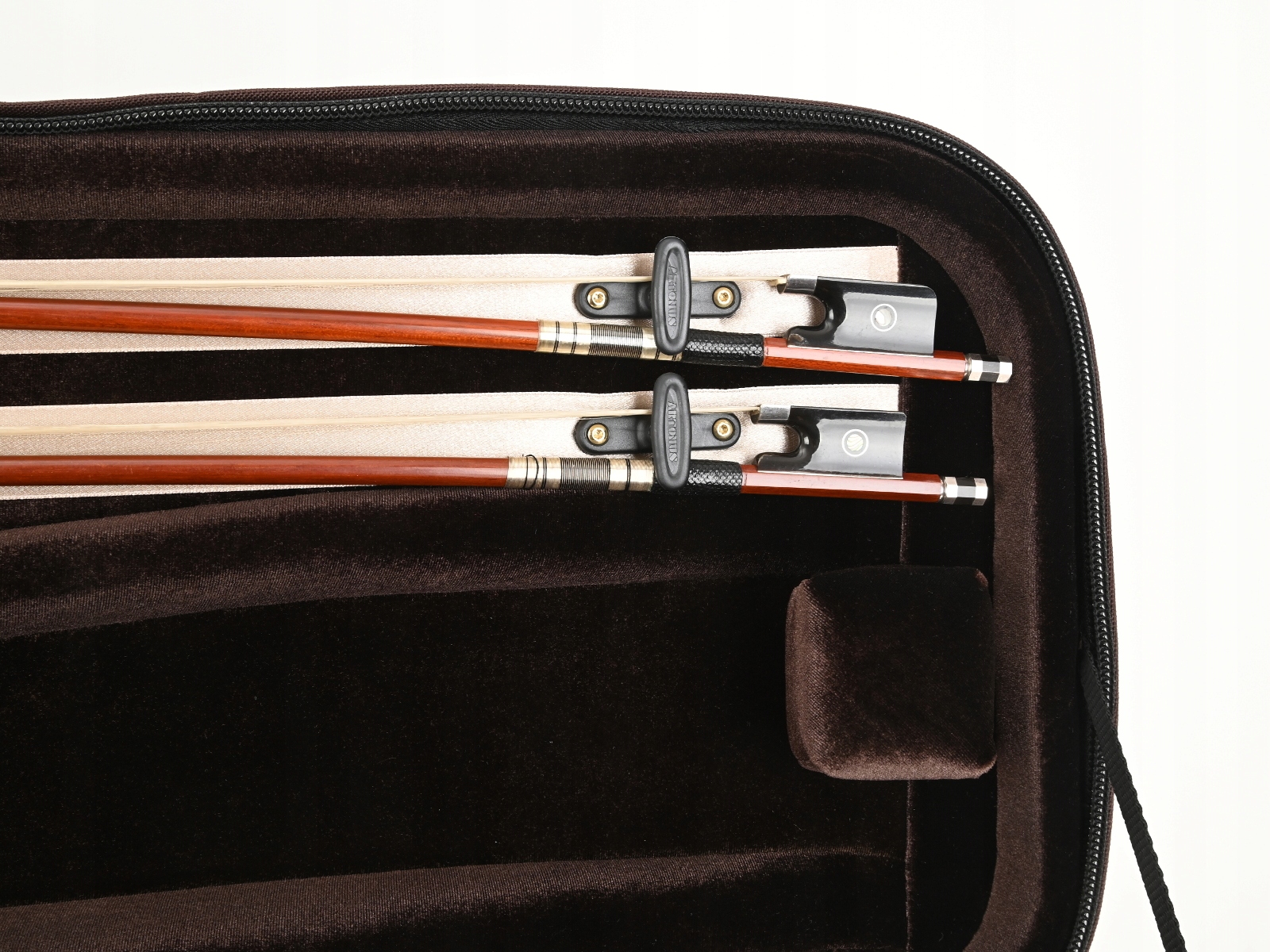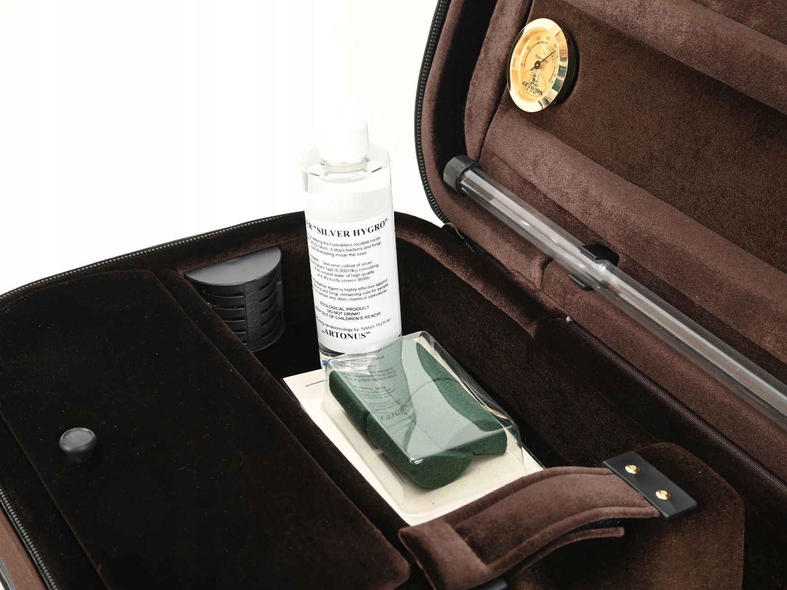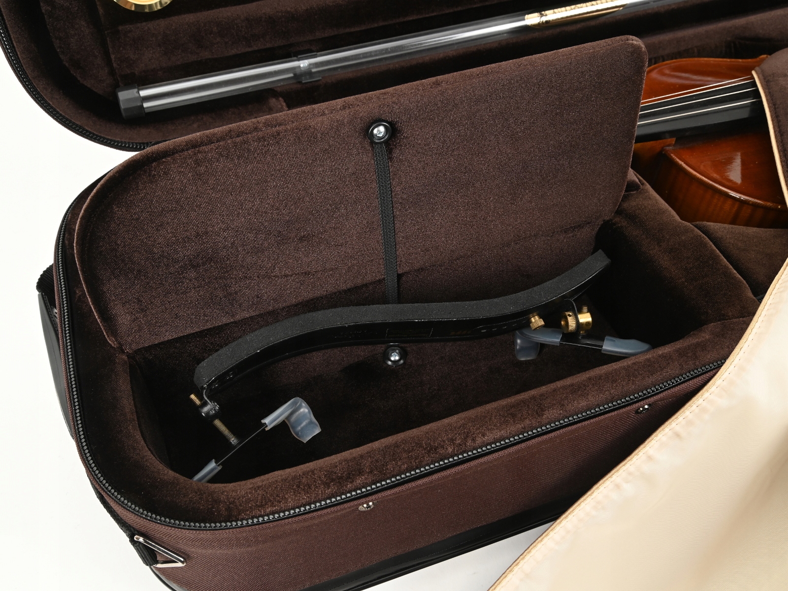 Футляр имеет вместительный карман для нот, что не увеличивает его габариты. В нем используется система ручек, которая затрудняет подъем открытого корпуса и тем самым защищает инструмент от случайного падения. Внутренняя часть футляра альта отделана мягким бархатом темных тонов с черной и золотой фурнитурой. Он имеет регулируемое пространство в зависимости от ширины корпуса инструмента. Футляр для альта, оснащенный гигрометром и увлажнителем воздуха, а также запасом специальной воды и картриджей, позволяет обеспечить надлежащие условия хранения инструмента.