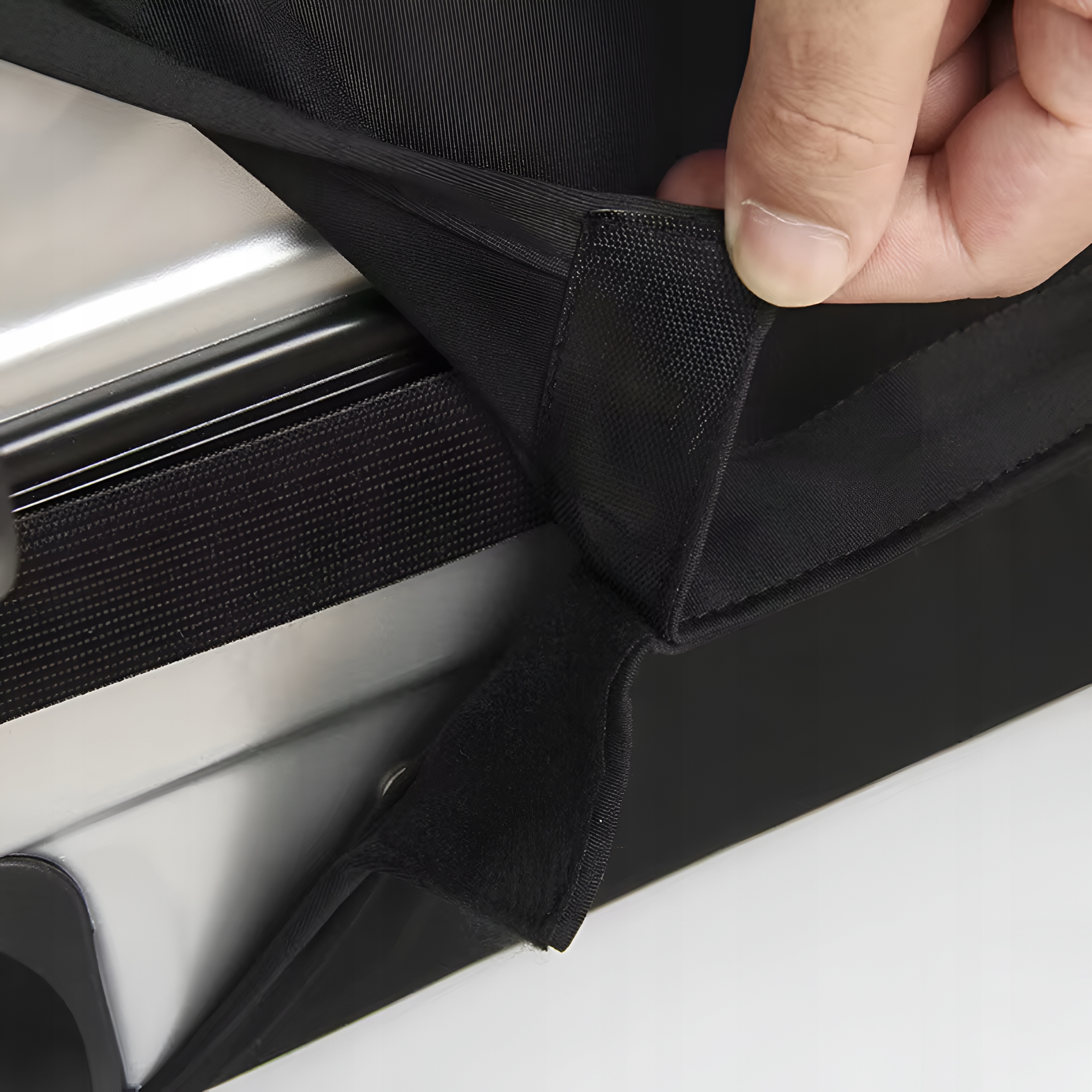 Чехол надевается на чемодан сверху, а затем фиксируется снизу липучкой, что гарантирует устойчивое прилегание.
