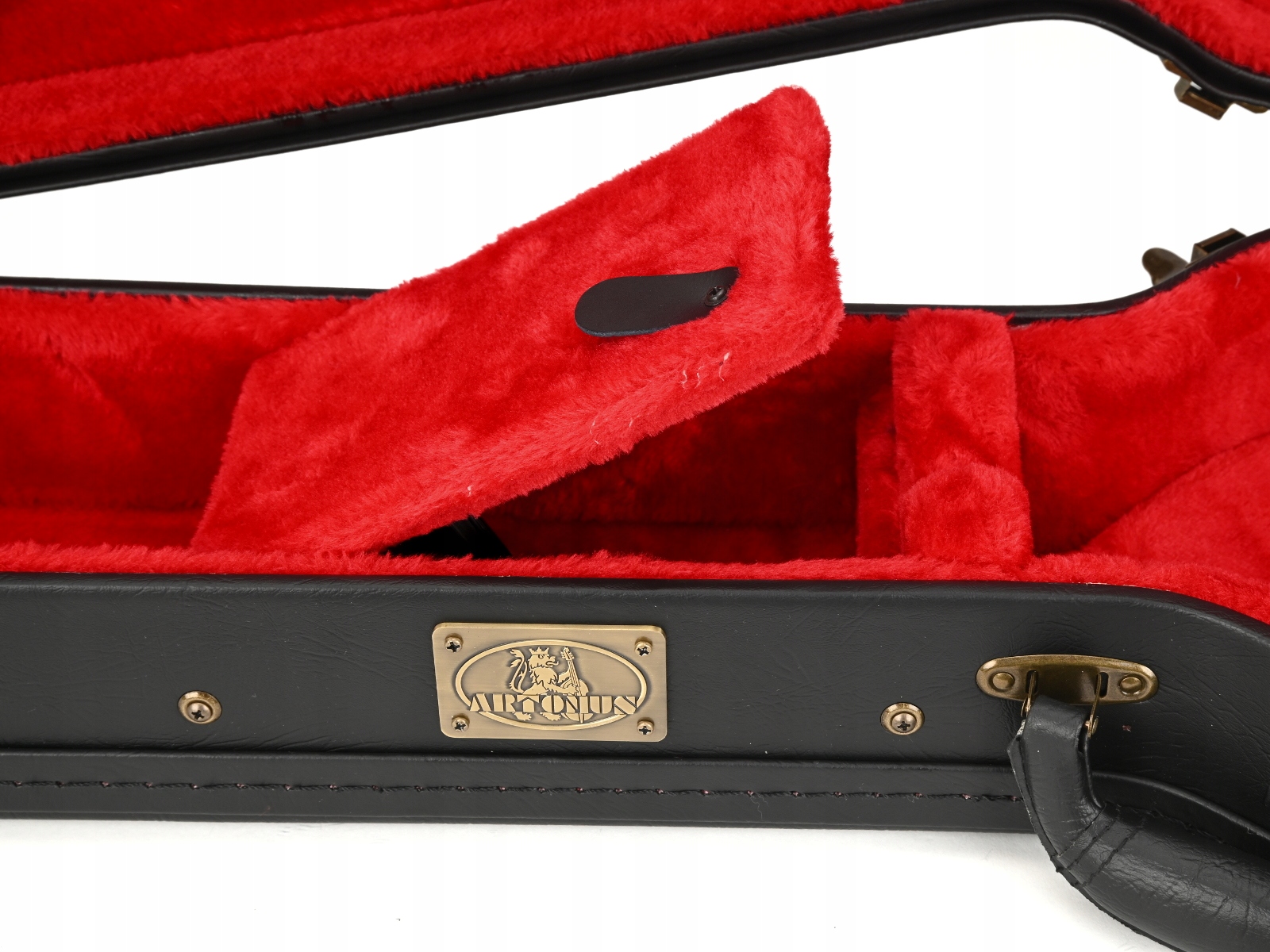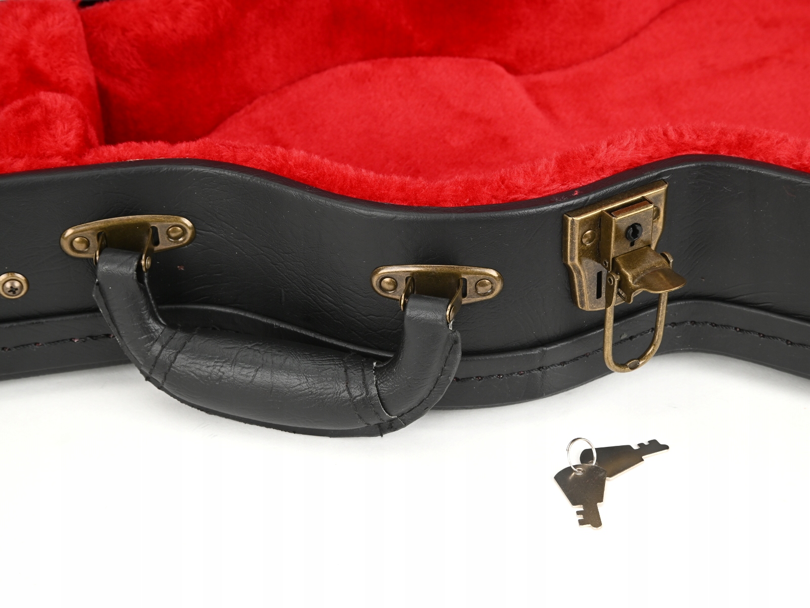 Конструкция выполнена из деревянной фанеры с крышкой «арочной вершиной», прекрасно защищающей инструмент от повреждать. Чехол гитары снаружи покрыт искусственной кожей. Внутри на подкладке из губки и толстого плюша. Это создает отличную теплоизоляцию и амортизацию инструмента. Этот чехол для гитары в настоящее время выпускается в двух цветах. Ориентировочный вес 3,7 кг. Чемодан оснащен кожаной ручкой в форме банана и пятью замками, один из которых имеет ключ. Внутри имеется отсек для хранения аксессуаров. Сделано в Китае.