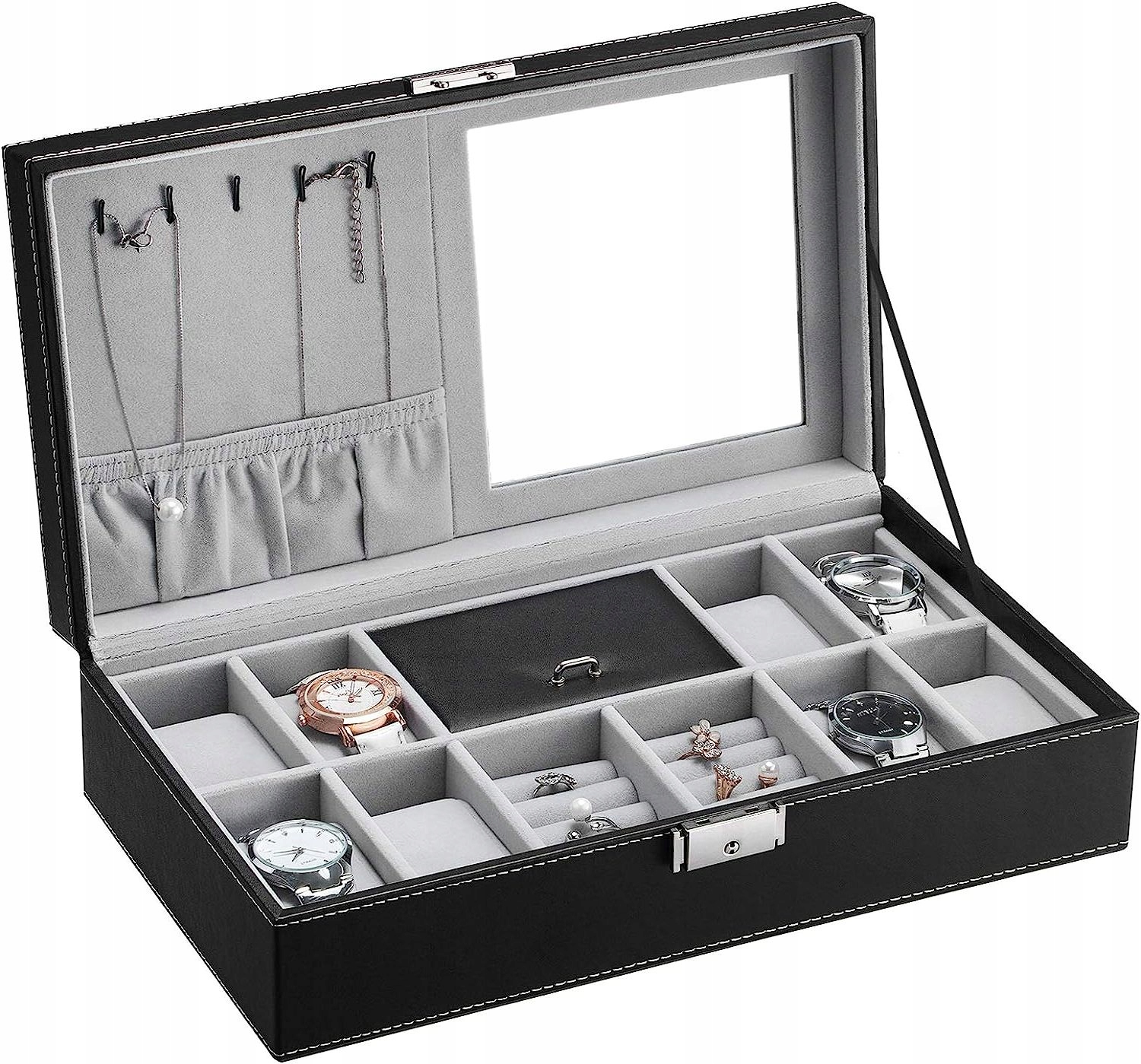 p>➡️ С 8 отделениями для часов, 2 решетками для колец, 1 футляром для драгоценностей, которые обеспечивают достаточно места для хранения, поэтому все ваши часы могут быть организованы.