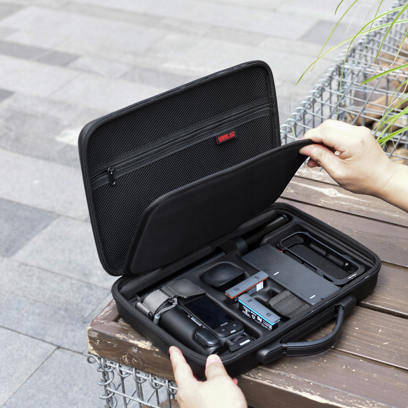 - 【ДВУХСЛОЙНОЕ ХРАНЕНИЕ】 В футляре для переноски имеются отделения, приспособленные для хранения и защиты X5 и аксессуаров: камеры X5 и складной селфи-палки 2 в 1, концентратора для быстрой зарядки, селфи-палки Bullet Time 2.0/114 см, селфи-палки, 7 аккумуляторов, Крышка объектива, металлическая рамка и т. д. Пружинной конструкции разделительной пластины достаточно для размещения фильтров, карт памяти, кабелей передачи данных, опорных стоек и т. д. В верхнем интернет-кармане можно хранить некоторые неиспользуемые личные вещи, такие как кабели, запасные части, телефоны и т. д.